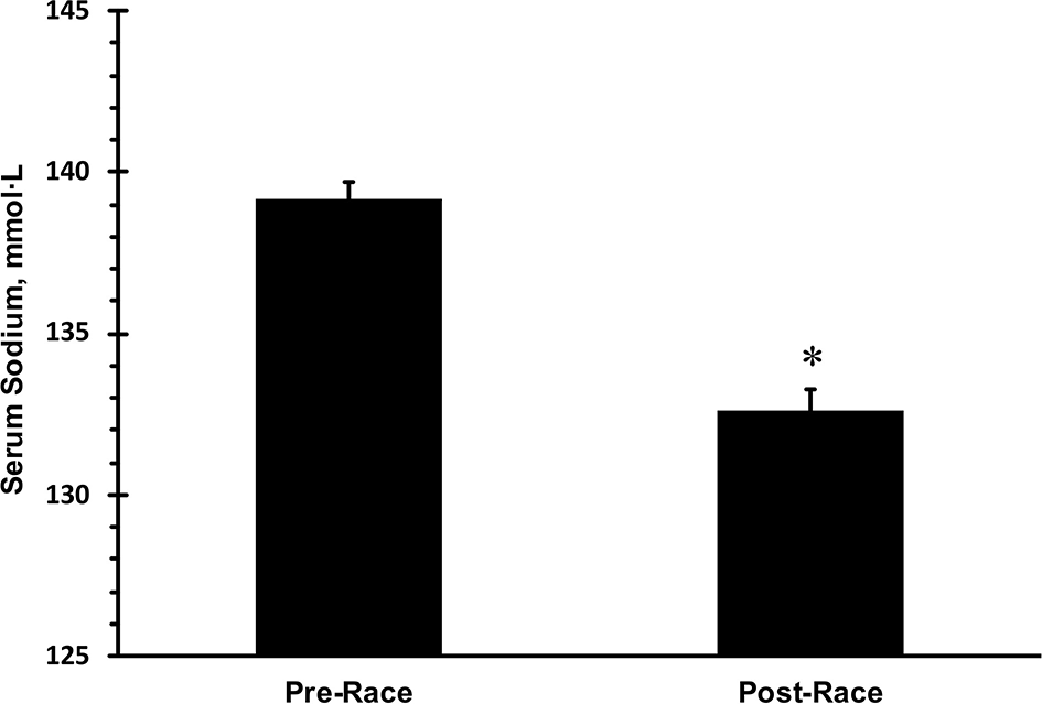 Figure 1. Mean pre- and post-race serum sodium in 63 finishers. *statistically significant different from pre-race values. Error bars depict standard error of the mean.