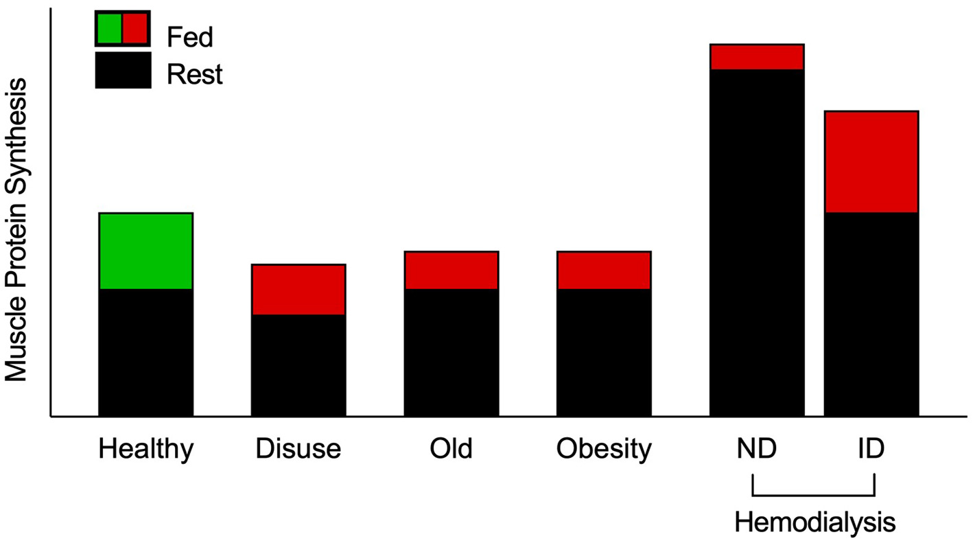 In healthy individuals aged ~18–50, who are not sedentary and eat sufficient daily amounts of protein and energy, the amount of skeletal muscle mass remains relatively unchanged throughout daily life (1). The maintenance of skeletal muscle mass is achieved by a daily net protein balance between muscle protein synthesis rates (MPS) and muscle protein breakdown rates (MPB). In contrast, skeletal muscle proteins are irreversibly lost with negatively imbalanced protein turnover, as observed with aging and catabolic pathologies. Muscle protein loss can occur as a result of increased MPB or reduced MPS (or by some combination of the two). However, it is believed that a desensitization of MPS to normal anabolic stimuli, such as feeding and exercise, may be the main culprit underpinning the age and disease-related decline in muscle quantity or quality (2, 3). This desensitization of MPS to normal anabolic stimuli, has also been shown in patients with kidney failure receiving maintenance hemodialysis (MHD), possibly due to their muscles being overstimulated (hyper-protein metabolic) from treatment (4). Finally, injury or illness leading to muscle disuse negatively influences post-absorptive MPS (5) and attenuates the postprandial anabolic response to protein ingestion in otherwise healthy young individuals (5, 6).
