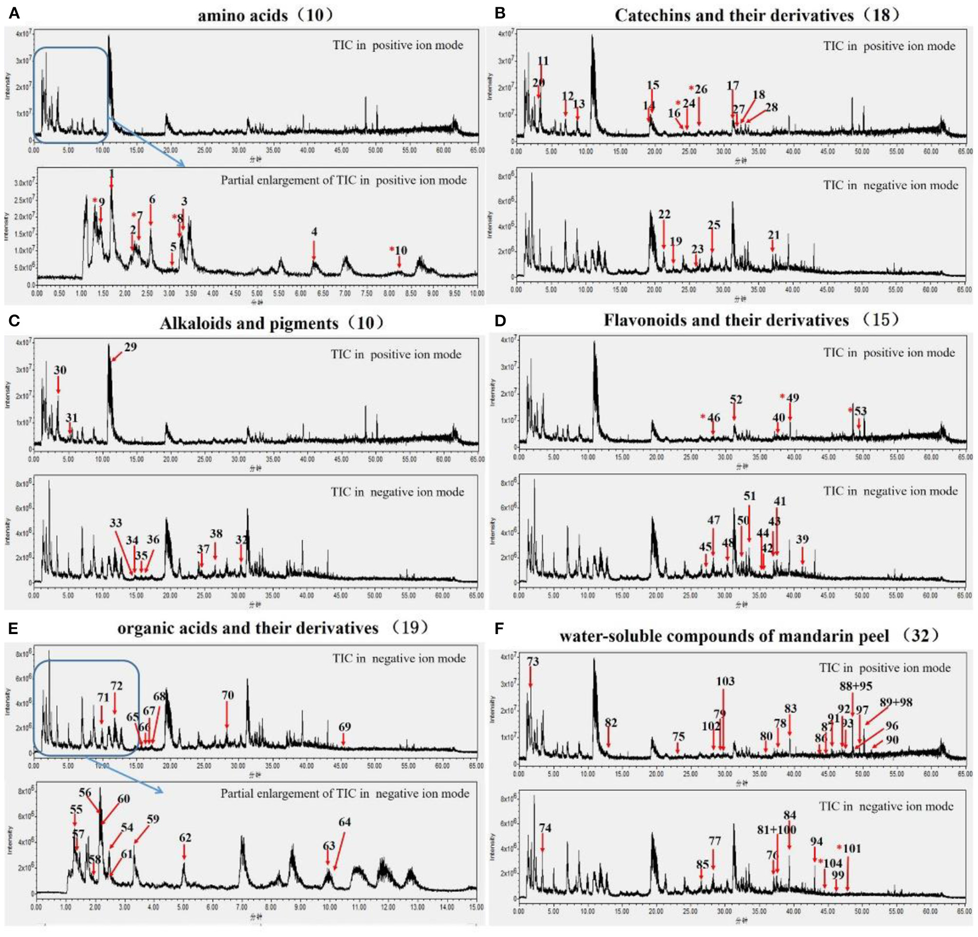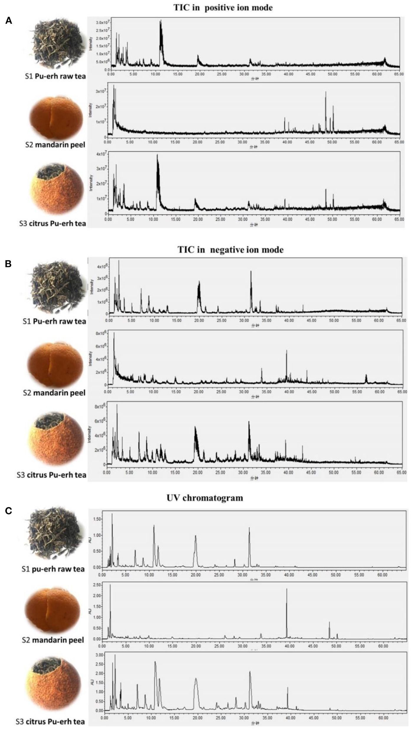 Comparisons of the chemical compositions among Pu-erh raw tea, mandarin peel, and Ganpu tea by TIC in positive ion mode (A), TIC in negative ion mode (B), and UV chromatogram (C), respectively. In our previous study, we investigated the source and conversion of aromatic substances of Ganpu tea. The fruity sweet aromas compounds of Ganpu tea were consisted of the main volatile components of Pu-erh raw tea and mandarin peel, in addition to the newly generated compounds during the sun-drying processing (14). Based on the data obtained from the present study, we could draw a similar conclusion that the water-soluble substances of Ganpu tea were not just a simple combination of the compounds of Pu-erh raw tea and mandarin peel. Rather, the water-soluble substances of Ganpu tea were mainly attributed to the development and transformation of the precursor ingredients that it contains and to several newly generated substances during the sun-drying processing. The final formation of the flavor of Ganpu tea may be closely related to the production and conversion of these water-soluble substances. Further researches are necessary to investigate the contribution of these compounds to the flavor characteristic of Ganpu tea.