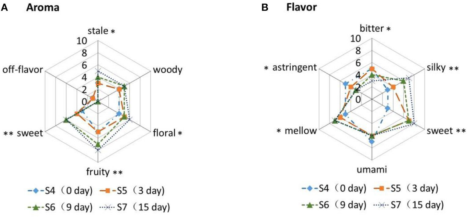 The tea infusion was evaluated by a well-trained panel of 10 members (five males and five females, age: 20–45). Tea samples were assessed using the flavor profile method of ISO 6564 (ISO, 1985). The DSA was performed according to the procedures described previously by Kraujalyt et al. (16) and GB/T 14487-2017, with a slight modification. Briefly, 3.00 g of Ganpu tea was infused with 150 mL of freshly boiled water for 5 min in a specialized DSA tea pot, then 50 mL of tea infusion was poured into a 150 mL-cup covered with a porcelain cover, which was provided to panelists in an odor-free laboratory at 25°C. Three-digit numbers were used to code samples, and they were randomly offered to panelists after brewing for aroma and flavor assessment. Panelists agreed that the samples could be described using six attributes for aroma: stale, woody, floral, fruity, sweet, and off-flavor, as well as six attributes for flavor: bitter, silky, sweet, umami, mellow, and astringent. The intensities of the aroma and flavor attributes were scored using a scale from 0 to 10, where 0 = none or negligible perceptible intensity, and 10 = extremely high intensity. Each sample was evaluated three times by each panelist on different days. Data were expressed as a mean.