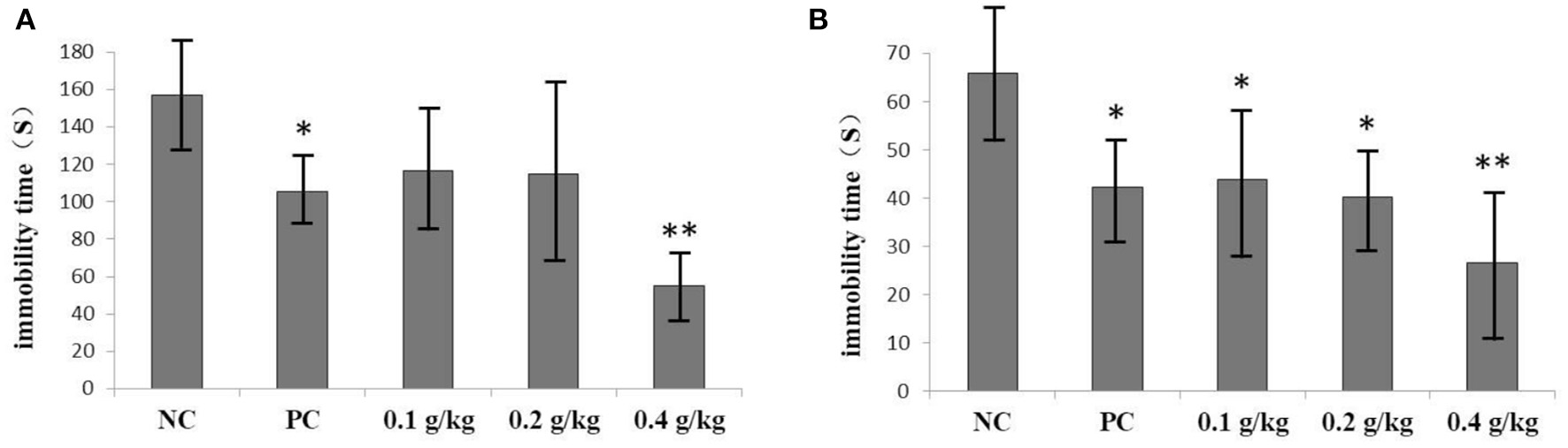 The TST is another model commonly used for examination of depressive-like behaviors (18). The tails of mice were taped in a balance bracket at a distance of 2 cm from the tail tip, with tail straight and head being hung down 15 cm above the desktop after 45 min from the last administration. The mice were separated by cardboard just in the case when they were interfered with each other. Each mouse was treated for 7 min; the first 2 min was for adaptation. The duration of immobility (no other body movements except respiration) in the last 5 min was recorded.