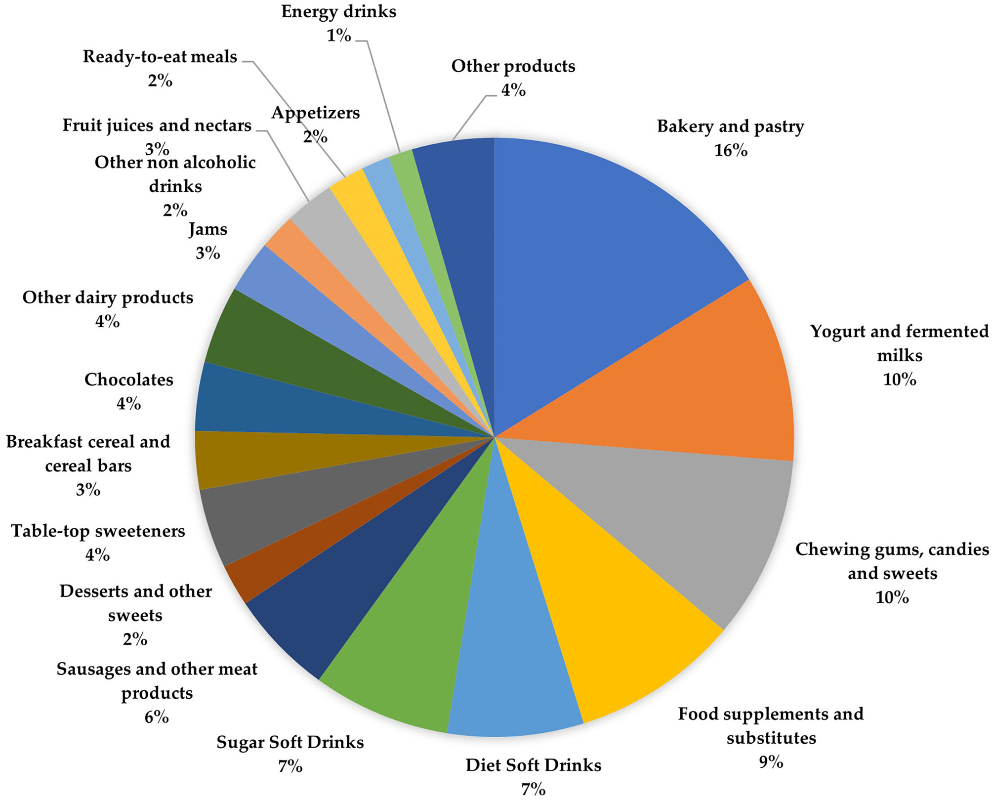 Then, in 2017, we started the compilation of a food composition database that included all products declaring LNCS in their ingredients lists (8). The present study follows the same methodology and, therefore, comparisons might be made with great precision. Concerning major food groups available, soft drinks, fruit juices and nectars, yogurts and fermented milk, and chewing gum and candies were coincident in their distribution. In turn, the new update shows a major proportion of bakery and pastry products (16% vs. 8%), supplement and meal replacers (9% vs. 4%), breakfast cereals and bars (3% vs. 1%), and ready-to-eat meals (2% vs. 1%). The food and beverage groups and subgroups containing LNCS are available more in number in the Spanish market, new food groups found in the present survey included meat and meat products (n = 73), fish and shellfish (n = 9), alcoholic beverages (n = 6), coffee and herbal teas (n = 6), and bread products (n = 5) and cheese (n = 2).