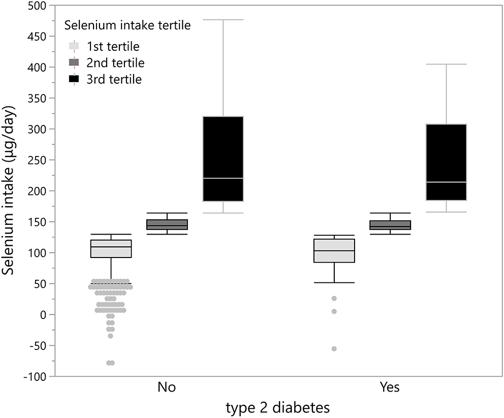 The exposure variable “selenium (Se) intake” was based on self-reported data on food intake; and subsequently, Se intake (μg/day) was calculated. Daily Se intake was adjusted by caloric intake using the residual method (28) and analyzed according to intake tertile.