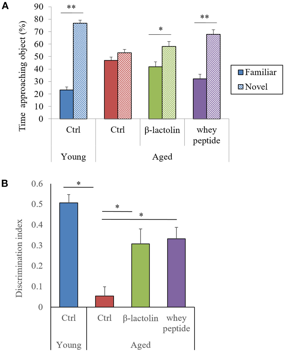 To evaluate the effects of β-lactolin and whey peptide rich in β-lactolin on memory impairment in aged mice, we fed mice aged 8 weeks (young) and 65 weeks (aged) a diet containing β-lactolin or whey peptide for 3 months and subjected them to behavioral memory evaluations using the NORT. The time taken by young mice to approach a novel object was significantly longer than that to approach a familiar object, but this difference was not observed at a significant level in the control aged mice; however, it was observed in the aged mice fed β-lactolin or whey peptide (Figure 1A). This difference in approaching time between familiar object and novel object was greater in aged mice with whey peptide than those with β-lactolin. There was not significantly different in approaching time for novel object among the groups. The DI for control aged mice was significantly decreased compared with that for young mice, and for aged mice fed with β-lactolin or whey peptide, the DIs were significantly increased compared with that for control aged mice (Figure 1B). The total time taken to approach each object did not differ among groups. These results indicate that object recognition memory in mice 80 weeks old had declined with age.