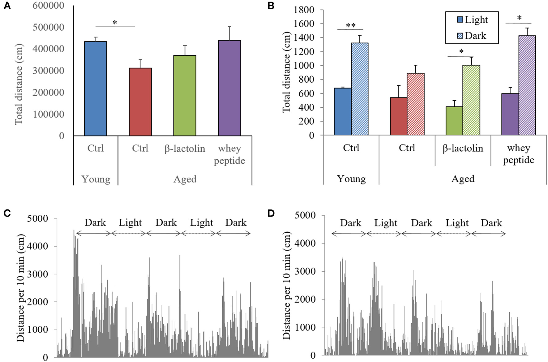 Measurement of activity during light/dark cycles. Distance traveled every 10 min over 72 h. Total distance in the home cage over 72 h (A) and the distance over 10 min during light and dark periods (B). Distance grap every 10 min over 72 h. by young mice (C) and aged control mice (D). Data are represented as mean ± SE and were analyzed by Student t-test (B) and one-way ANOVA, followed by the Tukey–Kramer test (A). *p < 0.05 and **p < 0.01.