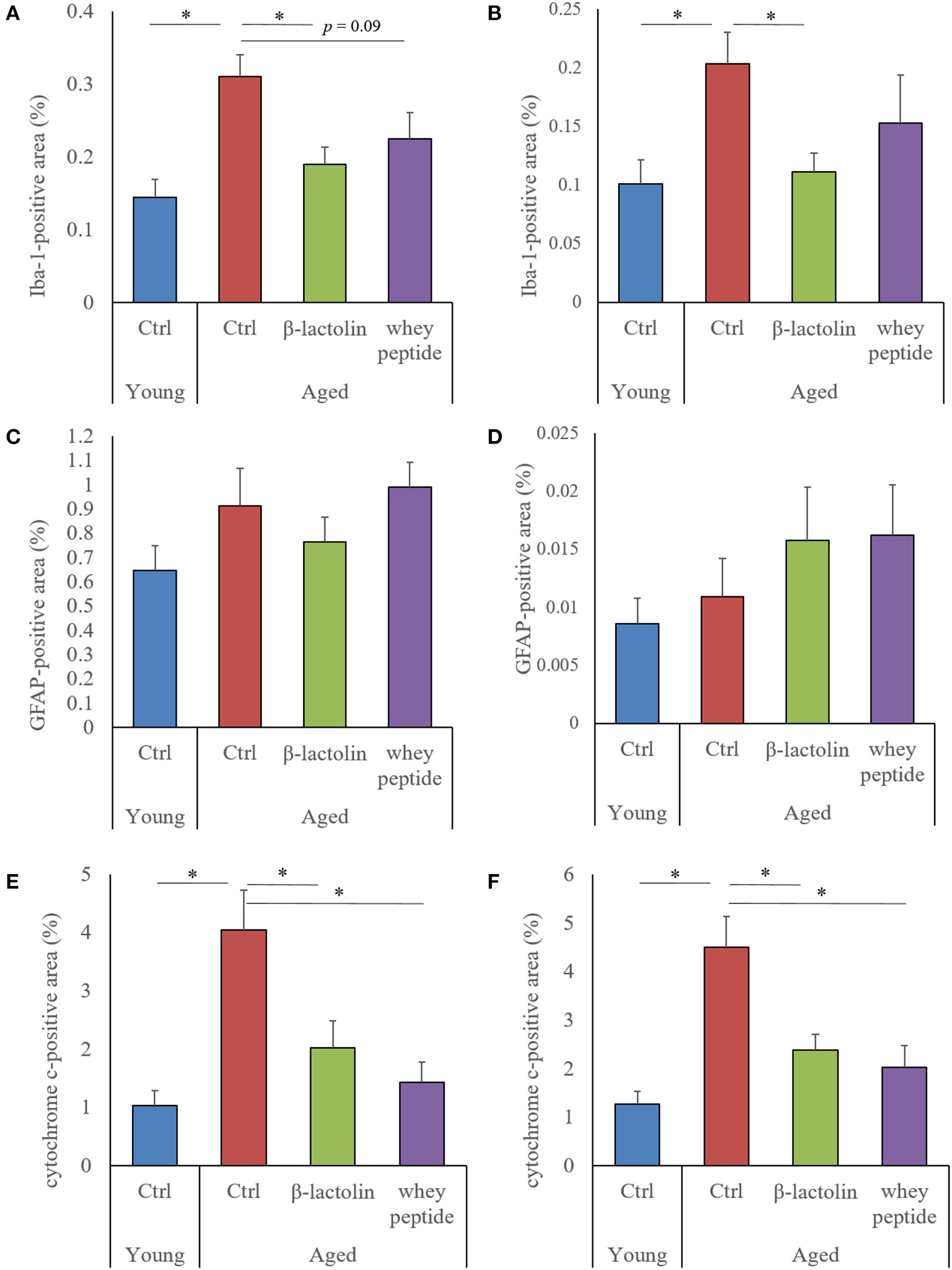 To evaluate the age-induced effects of β-lactolin and whey peptide rich in β-lactolin on glial activation and cytochrome C, we performed immunohistochemical analysis. The positive areas of Iba-1 in the hippocampus and cerebral cortex of control aged mice were significantly increased compared with those in young mice (Figures 3A,B, respectively). The Iba-1 positive areas in the hippocampus and cerebral cortex of aged mice fed β-lactolin were significantly lower than those in control aged mice (Figures 3A,B, respectively), and in the hippocampus of aged mice fed whey peptide, it tended to be significantly lower than that in control aged mice. The representative images in young mice, control aged mice, and aged mice fed with β-lactolin or whey peptide were shown in Supplementary Figures 2A–D, respectively. The positive areas of GFAP in the hippocampus and cerebral cortex did not show significant differences between young mice and aged mice (Figures 3C,D, respectively). The positive areas of cytochrome C in the hippocampus and cerebral cortex of the control aged mice were significantly increased compared with those of young mice and were significantly reduced in aged mice fed β-lactolin or whey peptide (Figures 3E,F, respectively).