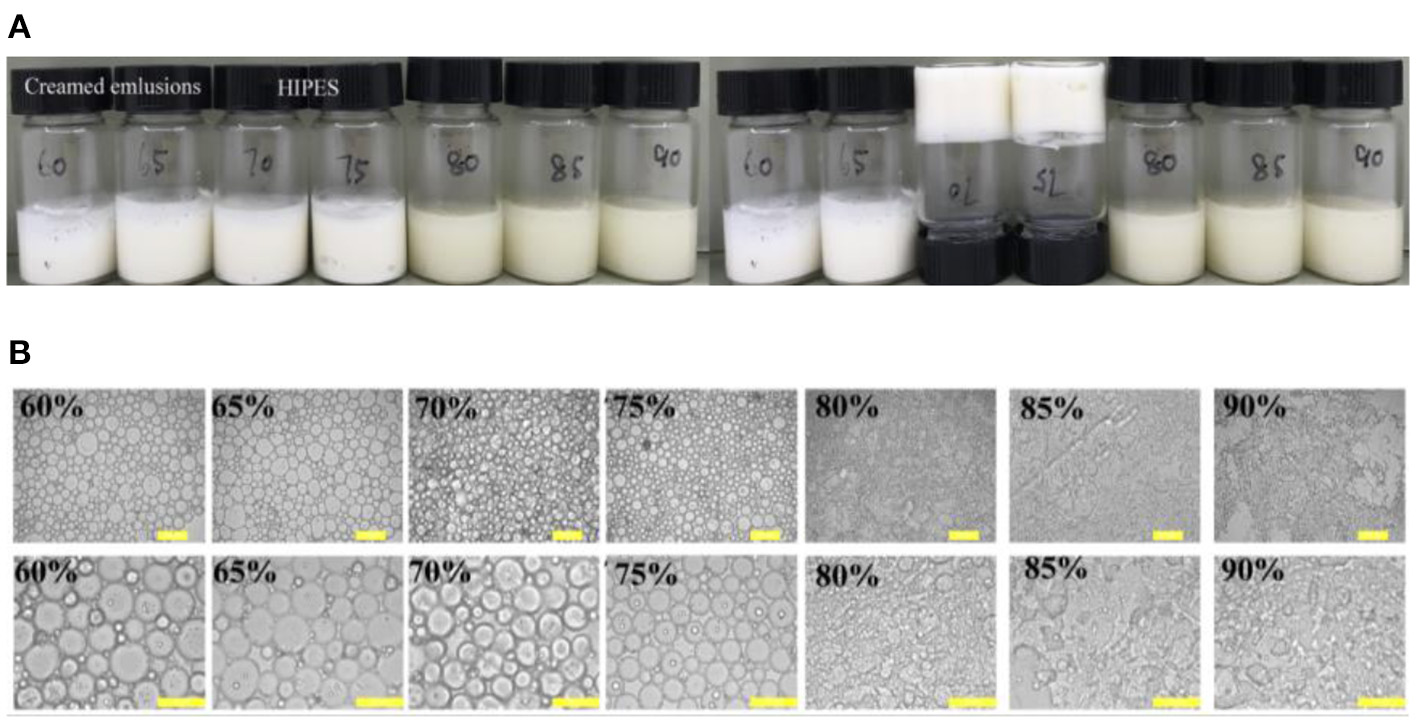 Freeze-thawing stability: To verify the freeze-thaw stability, the HIPEs were frozen at −20°C for 24 h and then thawed at 25°C for 4 h. The appearance and microstructure of the fresh or treated HIPEs were characterized by visual observation and optical microscopy, as described above.