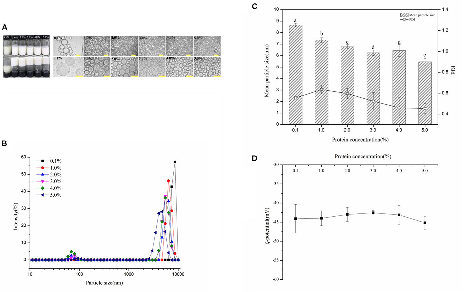 (A) Visual appearance and optical micrographs of fresh WSP-stabilized high internal phase emulsions (HIPEs) (oil fraction, ϕ = 75%), at varying protein concentration c values of 0.1, 1, 2, 3, 4, and 5%, respectively. The scale bars are 100 and 50 μm, respectively. (B) The distribution of the HIPE droplet size in the aqueous phase with varying protein concentrations. The mean particle sizes and polydispersity indexes (PDI) (C) and ζ-potential (D) of HIPEs prepared by WSP (0.1, 1, 2, 3, 4, and 5 wt%). Different letters (a, b, c, d, e) in the same column indicate significant differences (p < 0.05.)