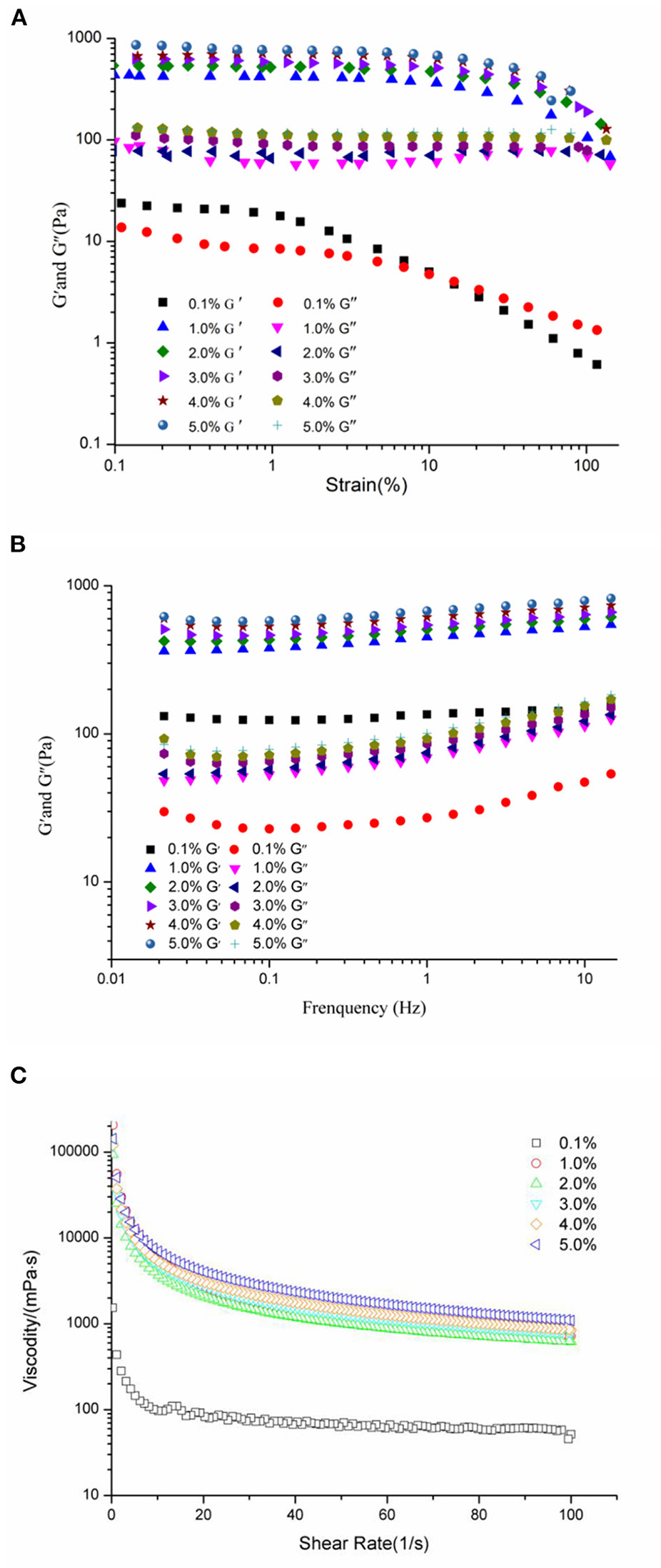 Rheological properties of HIPEs prepared by WSP (0.1, 1, 2, 3, 4, and 5 wt%). Strain sweep (A) of the HIPEs with strain increased from 0.1 to 100% at a constant frequency of 1 Hz. Frequency sweeps (B) curves at fixed strain (1%) with the frequency ranging from 0.01 to 15 Hz; Apparent viscosity (C) of the HIPE samples with shear rate from 0 to 100 1/s.