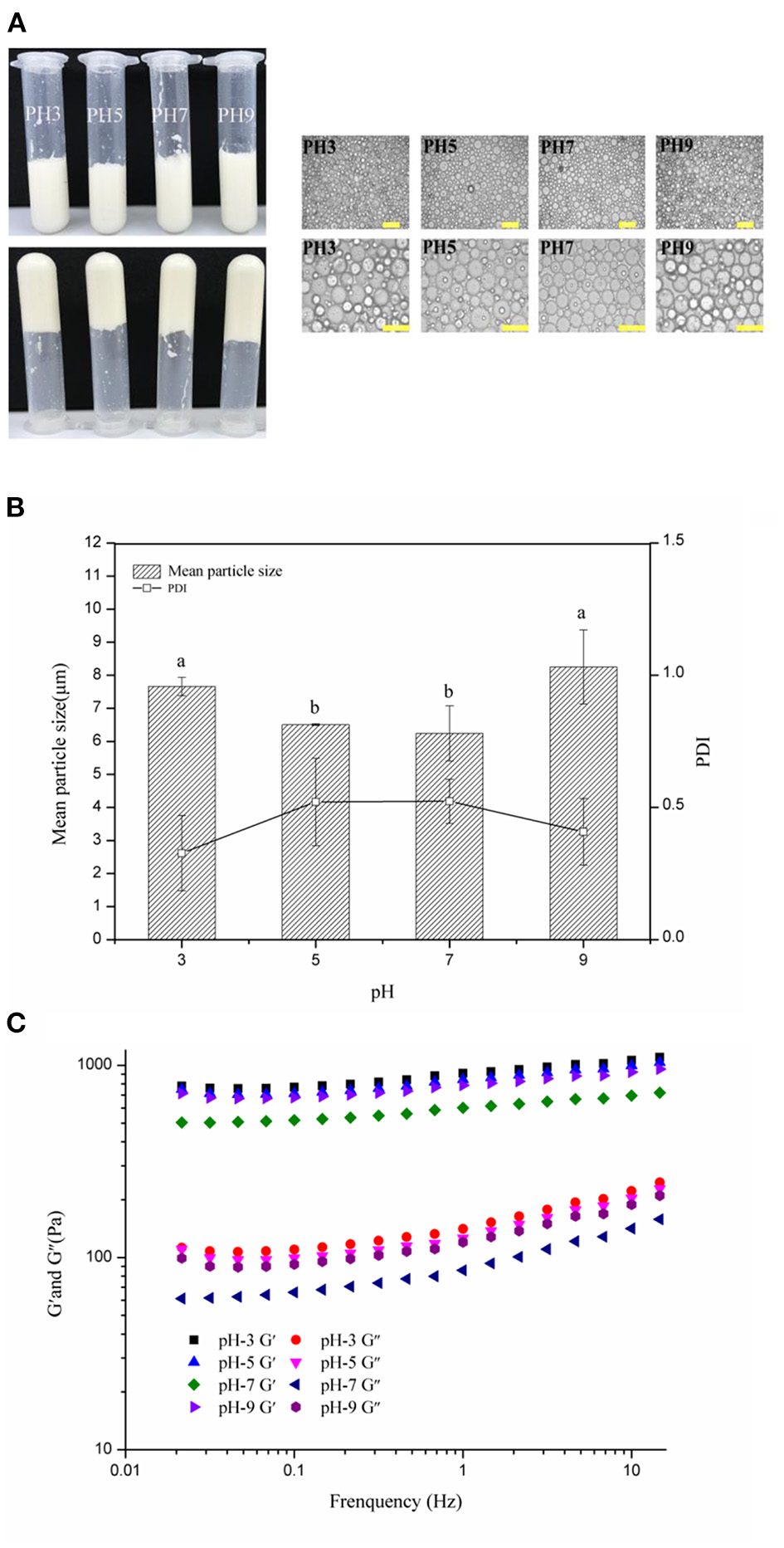 Visual appearance and optical micrographs (A), mean particle sizes and PDI (B), frequency sweeps (C) of the WSP-stabilized HIPEs at pH values of 3–9. Different letters (a, b) in the same column indicate significant differences (p < 0.05).