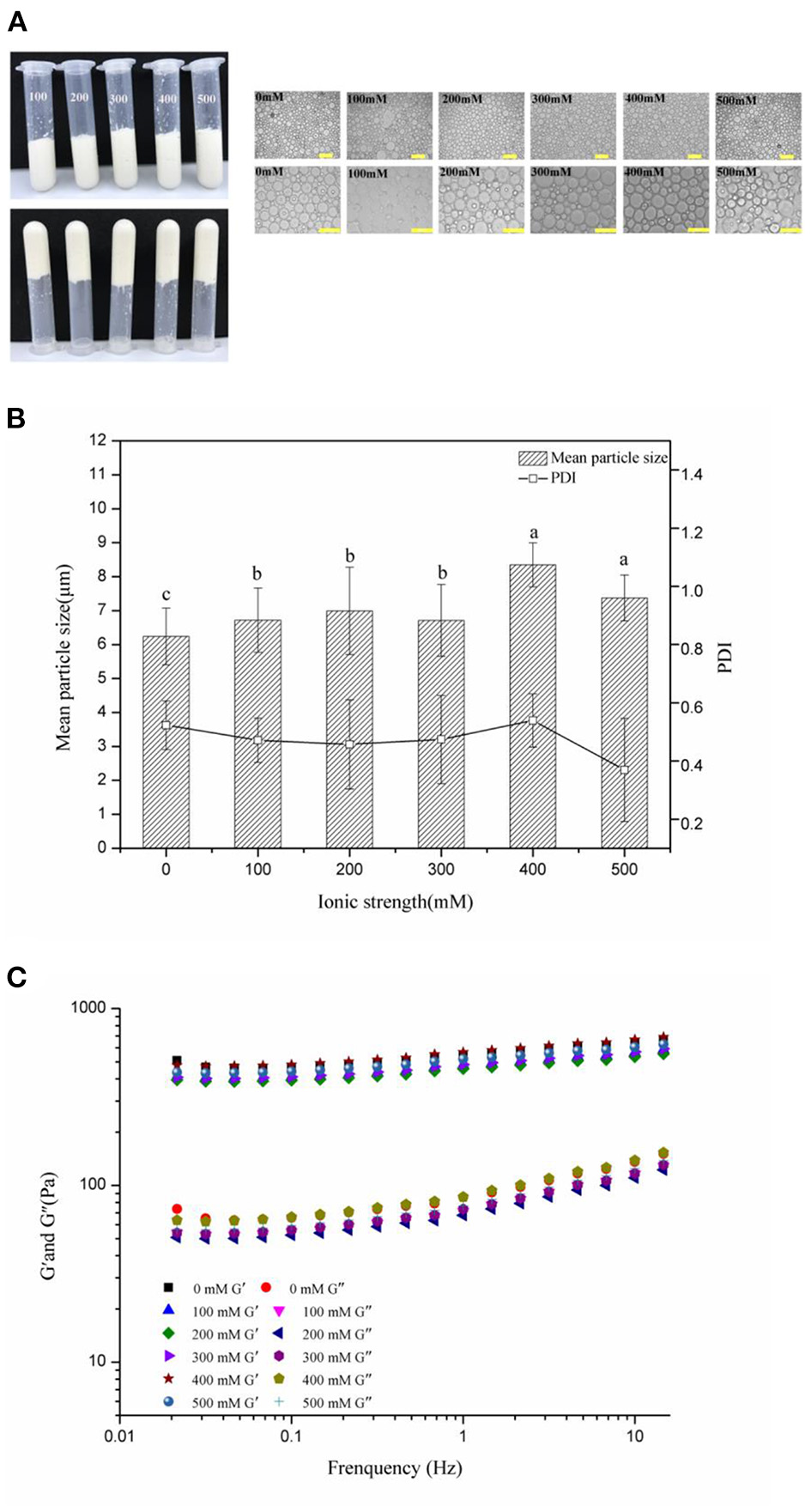 Visual appearance and optical micrographs (A), mean particle sizes and PDI (B), frequency sweeps (C) of the WSP-stabilized HIPEs at different salt concentrations. Different letters (a, b, c) in the same column indicate significant differences (p < 0.05).