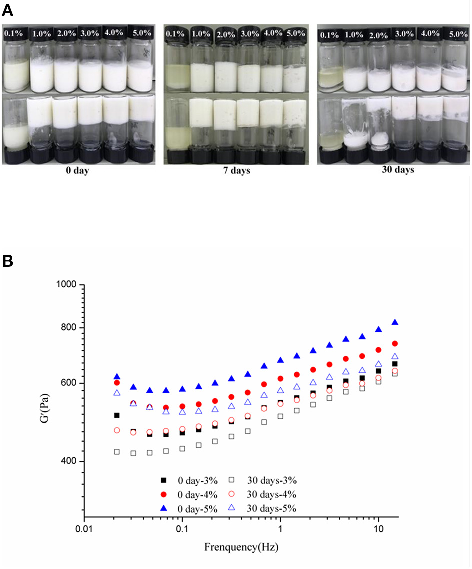 Visual appearance (c: 0.1, 1, 2, 3, 4, and 5%) (A) and frequency sweeps (c: 3–5%) (B) of the WSP-stabilized HIPEs during storage at 0, 7, and 30 days, respectively.