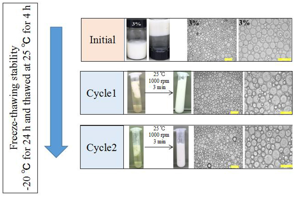 Visual appearance and optical micrographs of the WSP-stabilized HIPEs at a fixed c value of 3 wt%, before or after two cycles of freeze-thaw treatment. The scale bars are 50 and 100 μm, respectively. All the HIPEs were frozen at −20°C for 24 h and then thawed at 25°C for 2 h. In all cases, the same emulsification process was performed using a one-pot homogenization at 10,000 rpm for 3 min at room temperature.