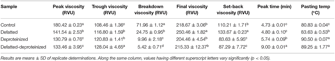 Table 4. Pasting properties of control, defatted, deproteinized, and defatted-deproteinized sorghum flour samples.