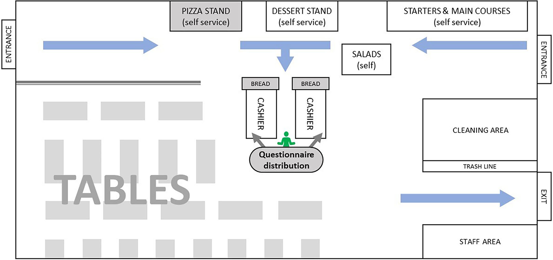 In addition to this, and on a separate page, the questionnaire included a short satisfaction survey, with two questions related to the main course [overall satisfaction; quality of the food (value-for-money)], and questions about participant's overall experience in the restaurant that day (time spent in the queue, ambiance, hunger before lunch, ate alone or with friends).