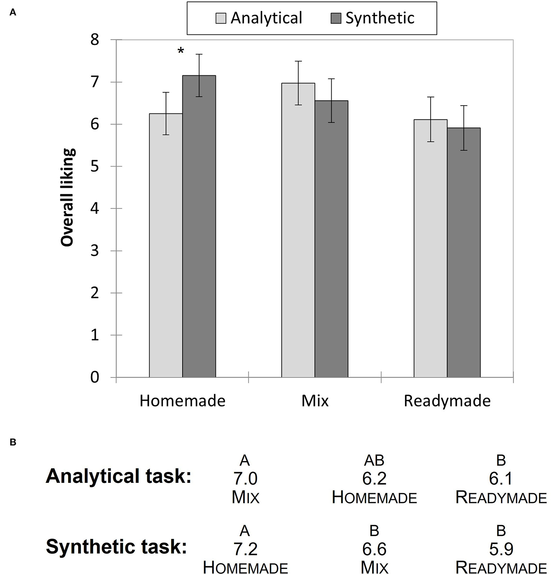 (A) Mean scores and standard errors for overall liking of the three pizza preparations for each task format, * indicates a significant difference at p < 0.05. (B) Rank order of the different pizza versions for the most liked to least liked according to each evaluation task. Letters above products denote significant differences (p < 0.05) found between each culinary preparation using post-hoc LSD test.