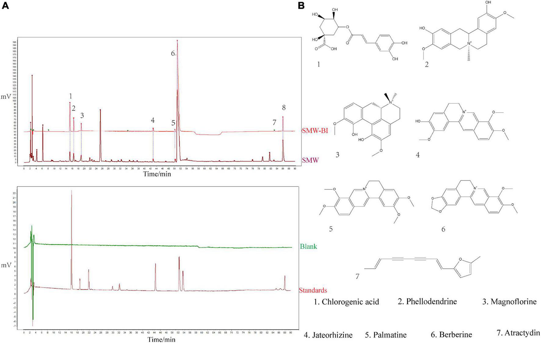 Phytochemical analysis of Simiao Wan (SMW) and bioactive ingredients of SMW (SMW-BI). Chromatogram of SMW-BI, SMW, blank, and standards (A, the concentration of SMW and standards are 40 mg/mL, 50 μg/mL). Chemical structures of SMW-BI (B).