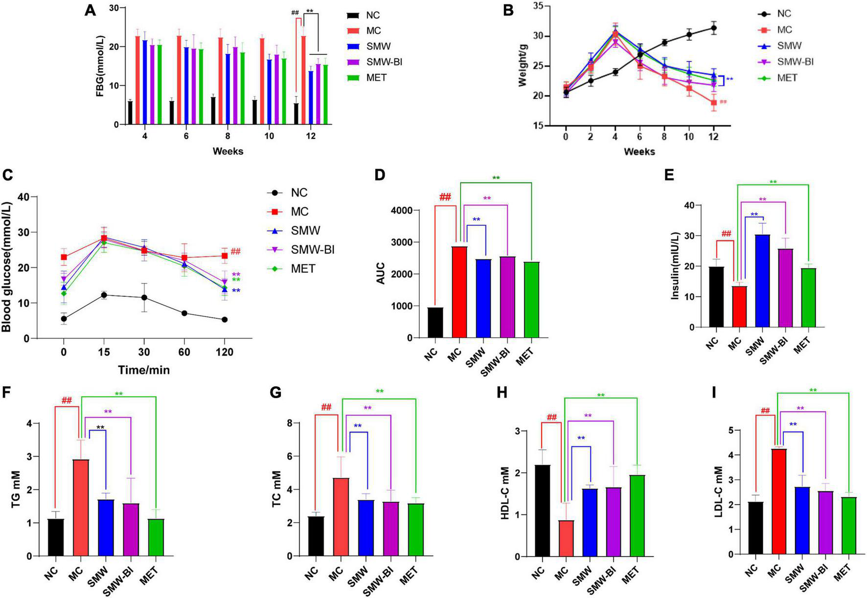 Effects of Simiao Wan (SMW) and bioactive ingredients of SMW (SMW-BI) on FBG (A), body weight (B), oral glucose tolerance (OGTT) (C), AUC0-2h (D), serum insulin (E), serum total triacylglycerol (TG) (F), total cholesterol (TC) (G), high density lipoprotein cholesterol (HDL-C) (H), and low-density lipoprotein cholesterol (LDL-C) (I) data are presented as the mean ± SD (n = 8). **P < 0.01 versus the model group (MC group), ##p < 0.01 versus the normal group (NC group).