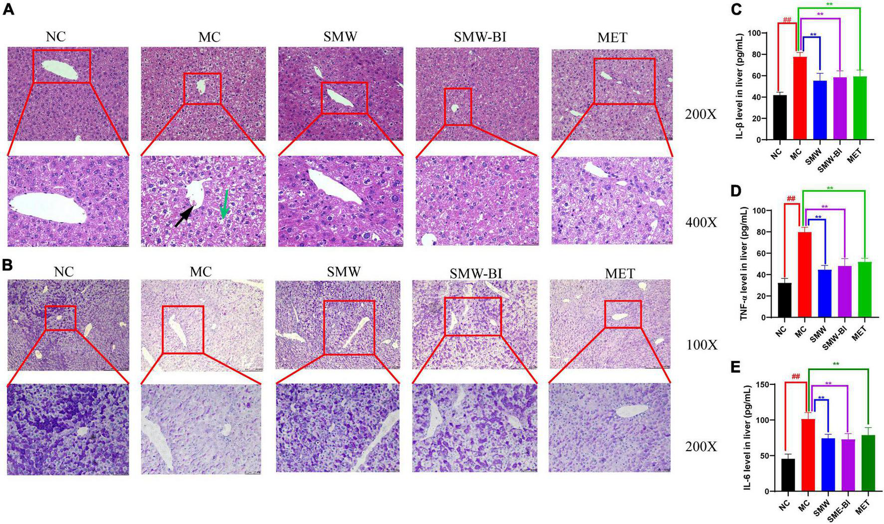 Liver cell injury is a common problem in diabetes (20). To evaluate the effects of SMW and SMW-BI on hepatocytes of T2DM mice, liver samples were stained with H and E. Compared to the NC group, the arrangement of hepatocytes in the MC group was disordered, and the cell boundary was not clear. In addition, in the MC group, liver fat cell degeneration (green arrow) was significantly reversed by SMW, SMW-BI, and MET treatment (Figure 3A). Moreover, SMW and SMW-BI also improved inflammatory infiltration in the liver of T2DM mice (black arrow).