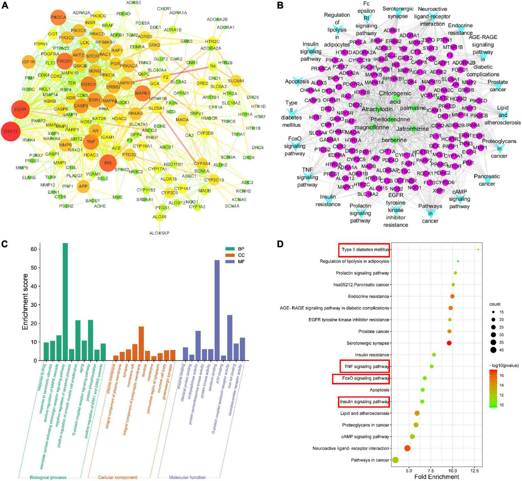 Network pharmacology analysis. protein-protein interaction (PPI) network (A), component-target-collateral (C-T-C) network (B), Gene Ontology (GO) analysis (C), and Kyoto Encyclopedia of Genes and Genomes (KEGG) analysis (D).
