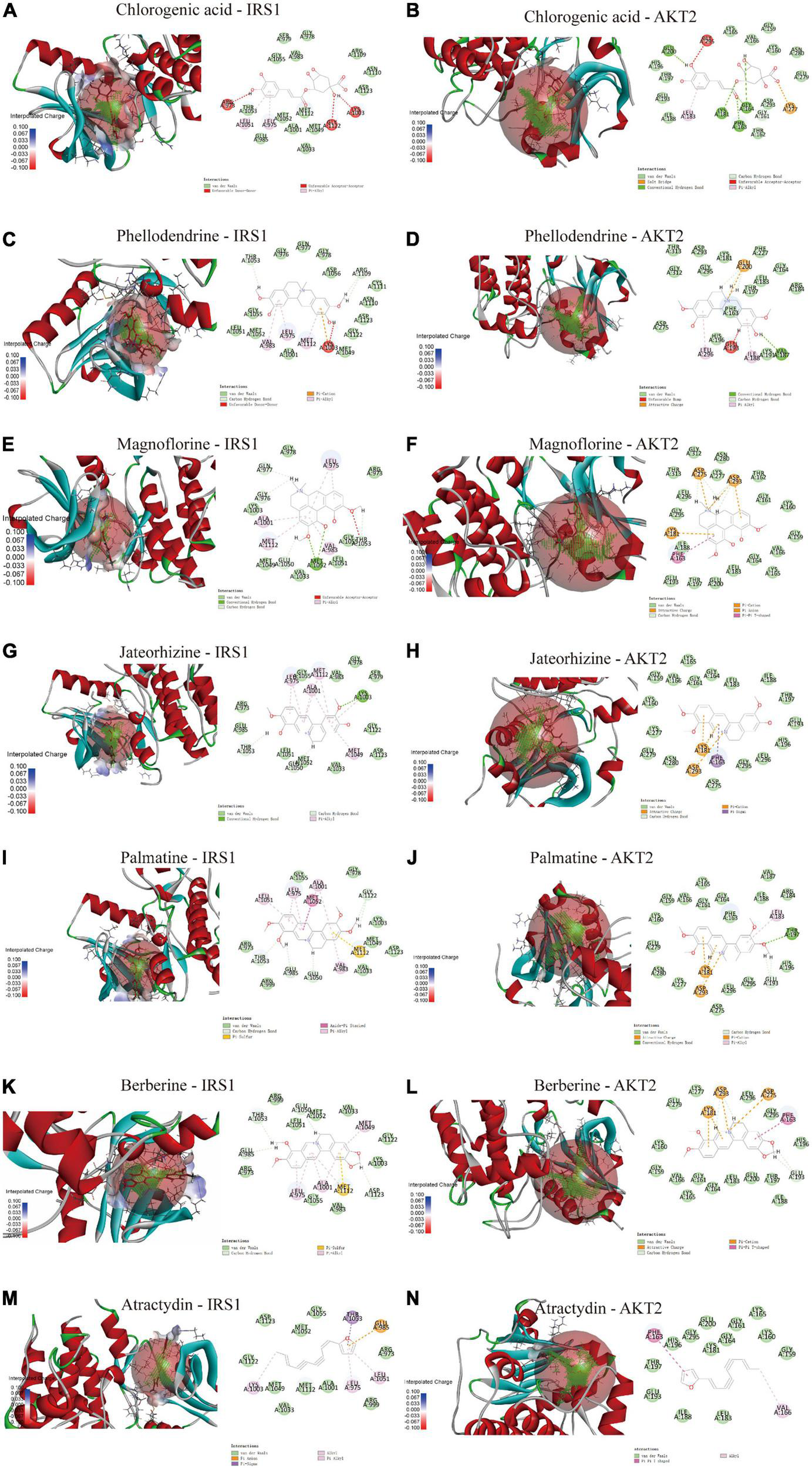 To further verify the RT-qPCR results, SMW-BI was docked with AKT2 and IRS1. Crystal structures of IRS1 (ID:1K3A) and AKT2 (ID:1O6K) were obtained from the PDB database.6 Discovery Studio 2019 (Dassault Systèmes, Vélizy-Villacoublay, France) was used to conduct follow-up docking experiments. Briefly, the proteins were dehydrated, hydrogenated, and added to electric fields to form an active pocket. Then, molecular docking between proteins and molecular compounds was performed using the default setting. The binding forces between the small molecules and proteins were analyzed using the docking fraction (19).