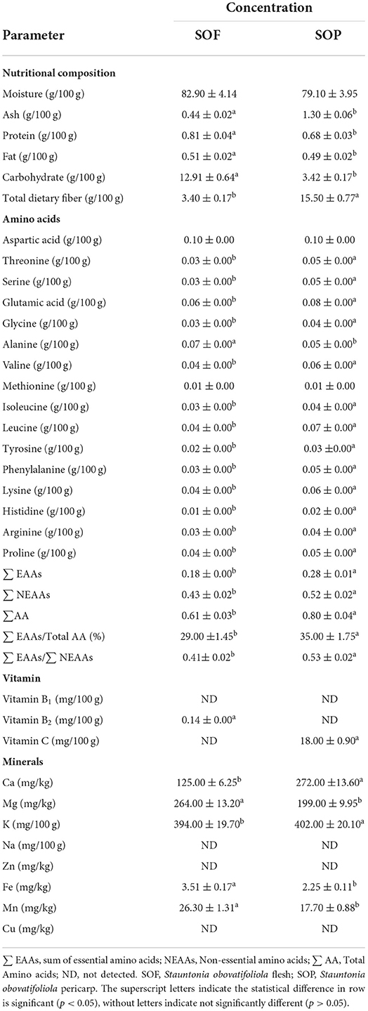 From Table 1, the nutrition and non-nutrient components of SOF (100 g) were as follows: moisture 82.9 g, ash 0.44 g, protein 0.81 g, fat 0.505 g, carbohydrate 12.91 g, and total dietary fiber 3.4 g. While the SOP (100 g) content was: moisture 79.1 g, ash 0.44 g, protein 0.81 g, fat 0.51 g, and carbohydrate 12.91 g. It could be found that the fat content was reported as the lowest (0.49 g) in SOP, in contrast, which consists of a higher amount of total dietary fiber (15.5 g). Amino acids are the basic units of protein and growth factor and vital nutritional elements in the human body. In terms of amino acid composition (Table 1), the content of total and essential amino acid compositions of SOP was higher than that of the SOF. Moreover, vitamin C (18 mg/100 g) was particularly abundant in SOP, which was an important and frequent antioxidant that could promote collagen regeneration and iron absorption, and prevent scurvy (31).