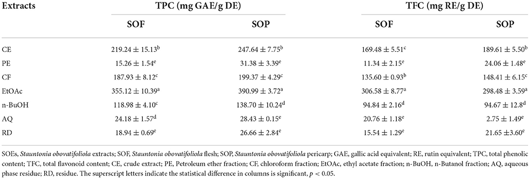 As described in the Methods Section Preparation of SO extracts, there were 7 SO extracts (SOEs) for SOF and SOP, respectively, which were in turn crude extract (CE), extract residue (RD), petroleum ether fraction (PE), chloroform fraction (CF), ethyl acetate fraction (EtOAc), n-Butanol fraction (n-BuOH), and aqueous phase residue (AQ). According to Table 2, all SOEs of SOP showed higher total phenolic content (TPC) than that of SOF, while the EtOAc fractions were significantly highest in both groups with values of 390.99 ± 3.72 and 355.12 ± 10.39 mg GAE/g DE (p < 0.05). That was proposed to be related to the abundant tannin in SOP (12, 35).