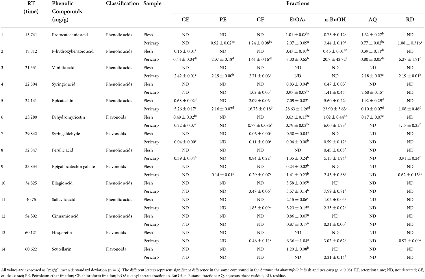 For SOP, nine phenolic acids and five flavonoids were quantified in the EtOAc fraction, and the most abundant phenolic was epicatechin (28.63 ± 1.26 mg/g), which was significantly higher than that in the SOF (p < 0.05). Overall, the CE, CF, EtOAc, and n-BuOH fractions of SOP contained more epicatechin, and the PE fraction was most abundant in terms of P-hydroxybenzoic acid, while the AQ and RD fractions were richer in syringic acid (Figure 6B). Interestingly, ferulic acid was only detected in the EtOAc fraction of SOP, but not the EtOAc fraction of SOF, whereas scutellarin appeared only in the EtOAc fraction of SOF but not the EtOAc fraction of SOP. Our result was consistent with the previous literature that pericarp contained more flavonoids as compared to the flesh (42).