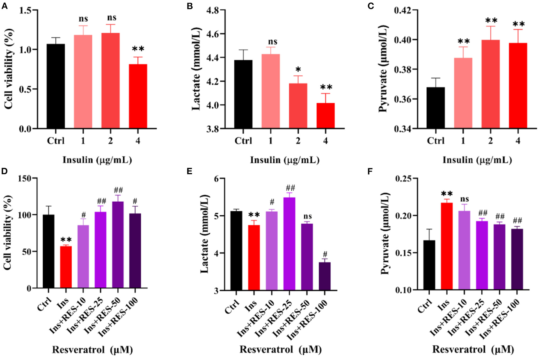 Then, we deeply explored the mechanism of RES enhancing insulin sensitivity at the cellular level. As shown in Figures 2A–C, we treated KGN cells with different concentrations of insulin and detected the changes in cell viability, and the levels of lactic acid and pyruvic acid. The results of CCK-8 showed 4 μg/ml of insulin decreased KGN cell viability compared with that of the Ctrl group, while there was no significant difference in KGN cells after being treated with 1 and 2 μg/ml of insulin. The results of ELISA showed that with the increase in the concentration of insulin, the level of lactate decreased while pyruvate increased. Thus, we choose the 4 μg/ml insulin for the next experiment. With respect to the concentration of insulin, we added different concentrations of RES to cells. The results showed that 25 and 50 μm of RES could reduce the pyruvate level and increase the lactate level of cells treated with insulin (Figures 2D–F). Lactate has long been proposed to play an important role in follicular development (10); thus, we chose 25 μm of RES, which is the most significant in increasing lactate level for the follow-up experiments.