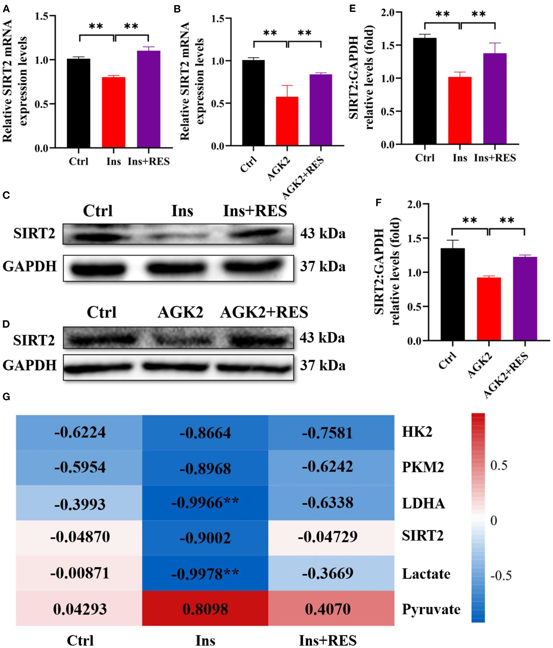RES can upregulate the expression of SIRT2 in KGN cells treated with insulin and AGK2. The relative mRNA expression levels of SIRT2 (A, B) in KGN cells were determined using qPCR. The protein level of SIRT2 was determined by Western blot (C, D) and quantified by ImageJ software (E, F). Correlation analysis between insulin sensitivity and glycolysis (G). Significant differences between groups are shown as **P < 0.01.