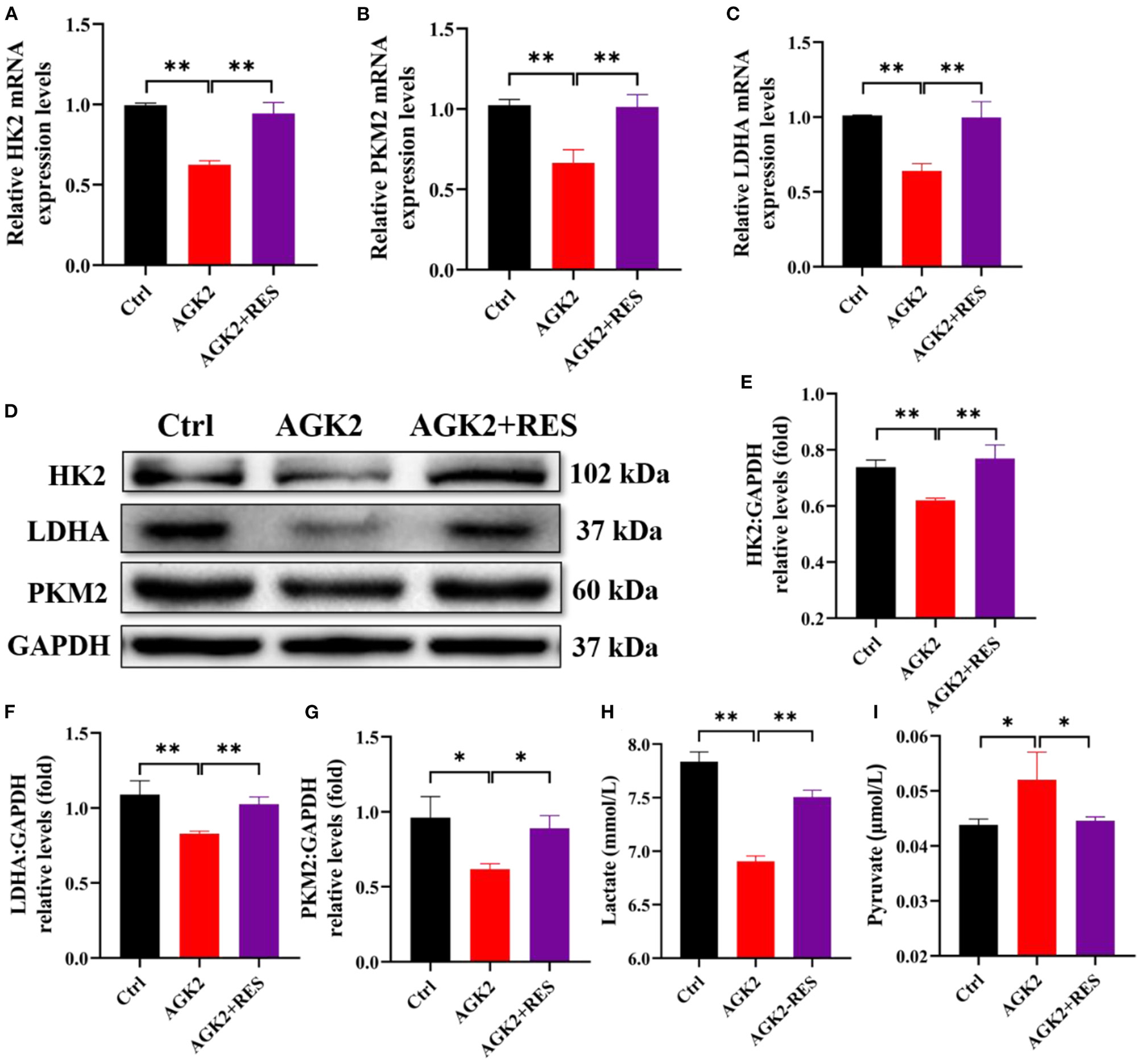 RES can upregulate the expression of SIRT2 in KGN cells treated with insulin and AGK2. The relative mRNA expression levels of HK2 (A), PKM2 (B), and LDHA (C) in KGN cells were determined using qPCR. The protein levels of HK2, LDHA, and PKM2 were determined by Western blot (D) and quantified by ImageJ software (E–G). The levels of lactate and pyruvate in KGN cells using ELISA (H, I). Significant differences between the groups are shown as *P < 0.05 and **P < 0.01.