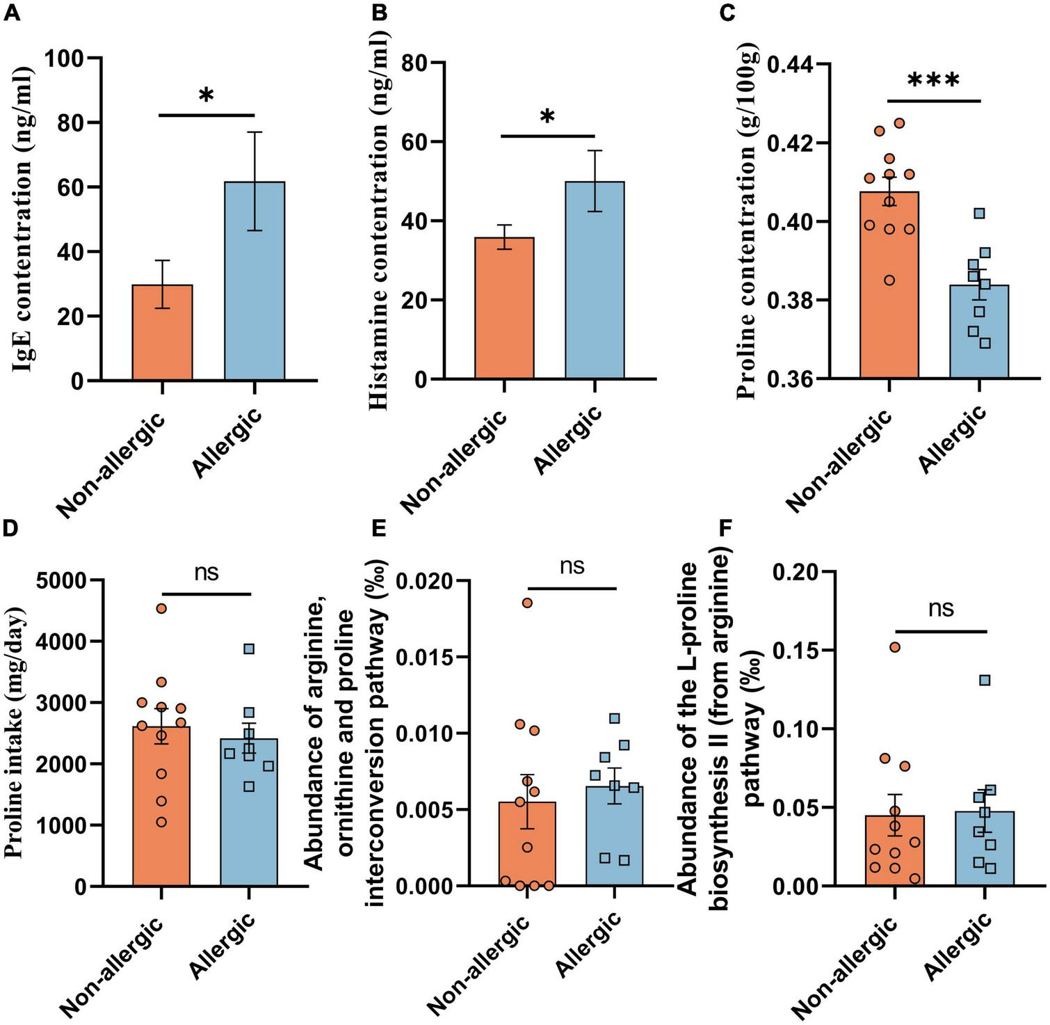 Intestinal proline correlated with allergy. The concentration of serum IgE (A), serum histamine (B), feces proline (C), and daily diet proline intake (D) of the volunteers in cohort study B were determined. And the abundance of the arginine, ornithine and proline interconversion pathway (E) and the abundance of the L-proline biosynthesis II (from arginine) pathway (F) were measured based on functional KO annotation of the metagenome. Data were presented as mean ± SEM. The statistical differences were calculated by Student’s t-test. *p < 0.05; ***p < 0.001; ns, not significant.