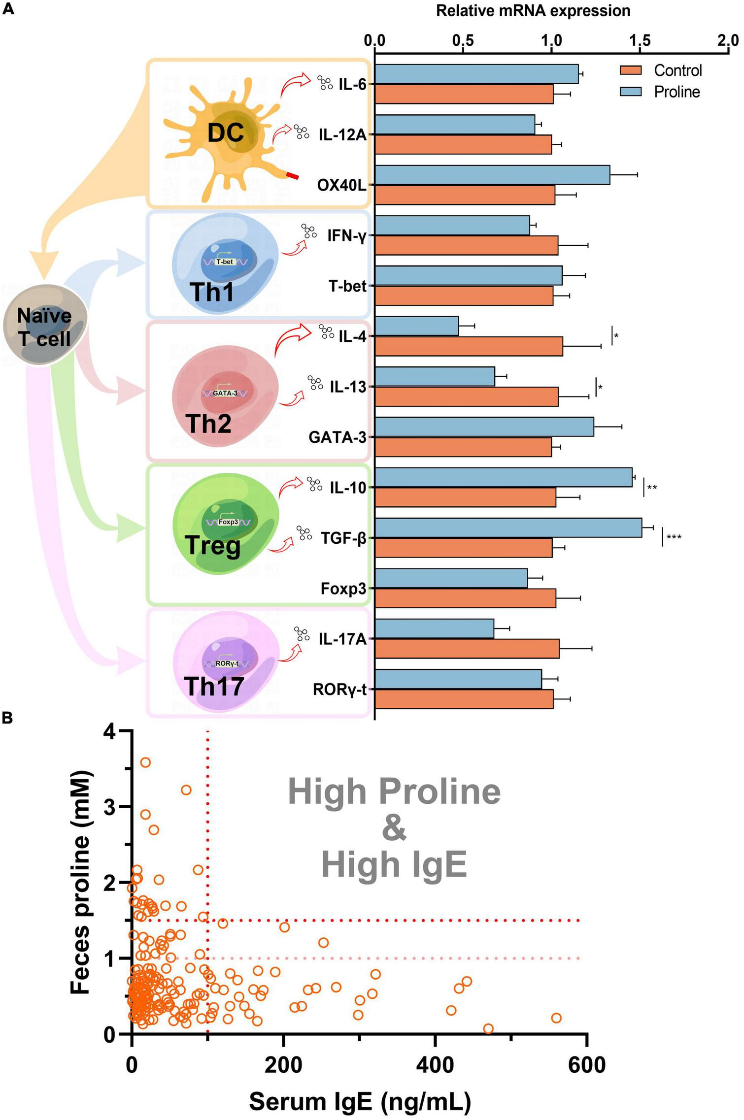 Proline down-regulates IgE concentration. (A) Mice spleen cells were treated by proline and the mRNA transcription of allergy-related proteins was determined by qPCR. (B) The concentration of feces proline and serum IgE of each individual in the cohort study. Data were presented as mean ± SEM. The statistical differences were calculated by Student’s t-test. *p < 0.05; **p < 0.01; ***p < 0.001; ns, not significant.
