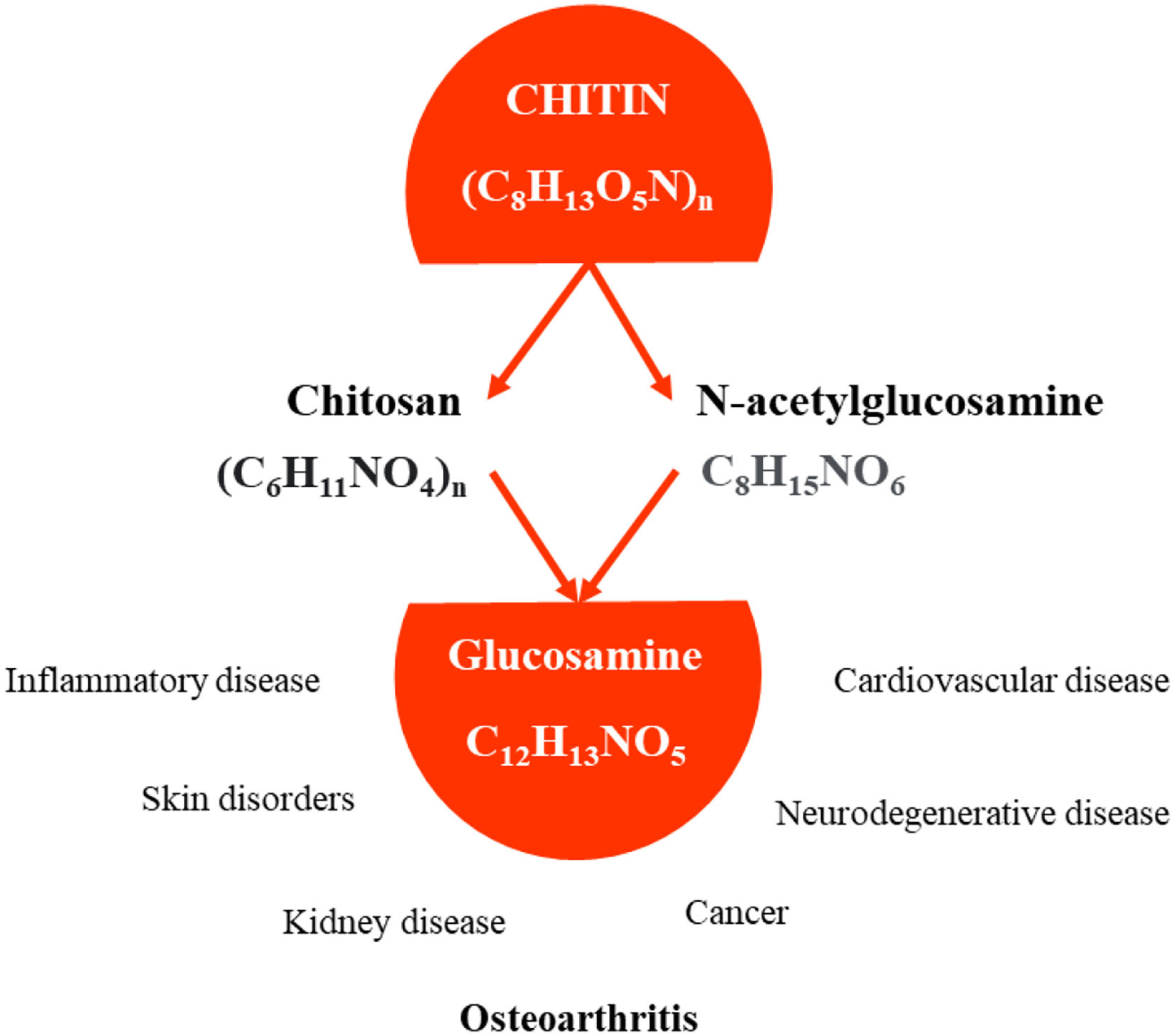 After plant cellulose, chitin is the most abundant biodegradable polymer in nature. Several mushrooms (e.g., Pleurotus, Termitomyces, Lactarius, and Agaricus) are rich in chitin (C8H13O5N)n, a long-chain polymer of N-acetylglucosamine, and the main component of the cell walls of fungi, insects, shrimp, and crustaceans shells (94). Chitin can be decomposed into glucosamine, which is involved in the creation of molecules that protect joints from inflammation and shields from other impacts on health (Figure 4).