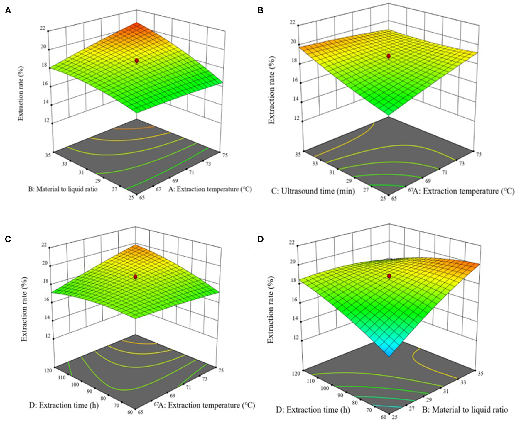 To more carefully analyze the optimal conditions for chestnut polysaccharide extraction, response surface methodology was used to explore the relationships between the four explanatory variables and the extraction rate as the response variable. In the response surface test, extraction temperature (A), solid-liquid ratio (B), ultrasonic time (C), and extraction time (D) were tested at five levels with the experimental design established using CCD of Design-Expert 12.0 software. The response surface analysis scheme and results are shown in Supplementary Table 5. Multiple regression fitting was conducted on the experimental data in Supplementary Table 6 to obtain a regression equation with the extraction rate of chestnut polysaccharide as the response value: