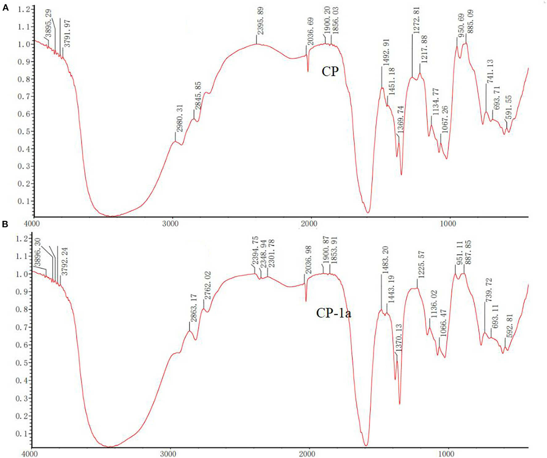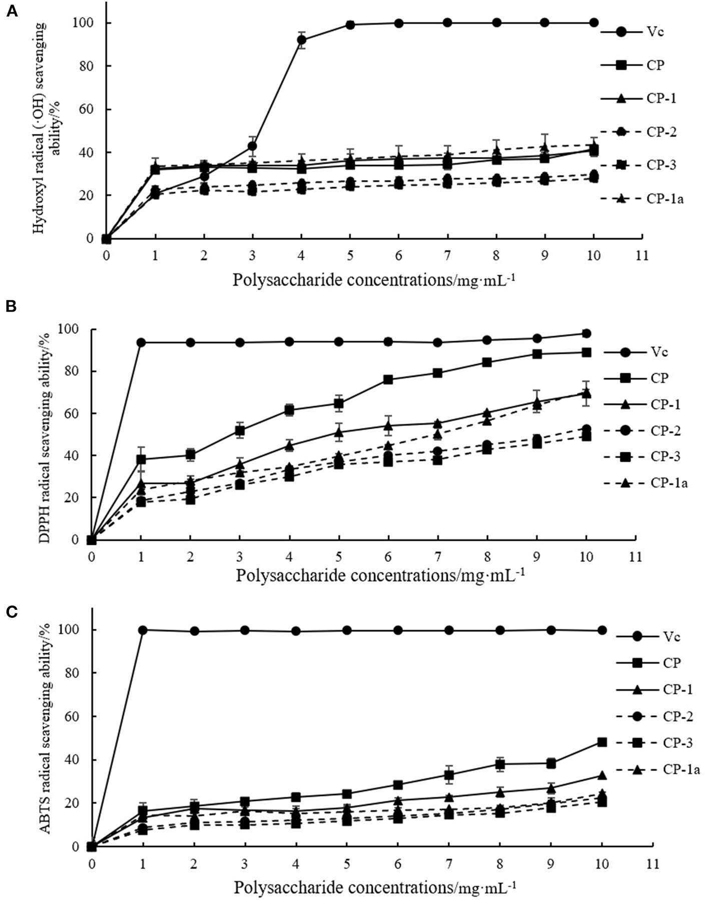 The CP-2 and CP-3 fractions exhibited poor activity. After purification, CP-1a had improved scavenging of hydroxyl radicals, but weakened scavenging of DPPH and ABTS free radicals. This may be caused by the removal of some other substances with antioxidant activity (such as polyphenols) or the destruction of some of the polysaccharide structure during purification (39–42). The ultrasonic treatment might oxidize the hydroxyl group, ultimately reducing activity (43–45).