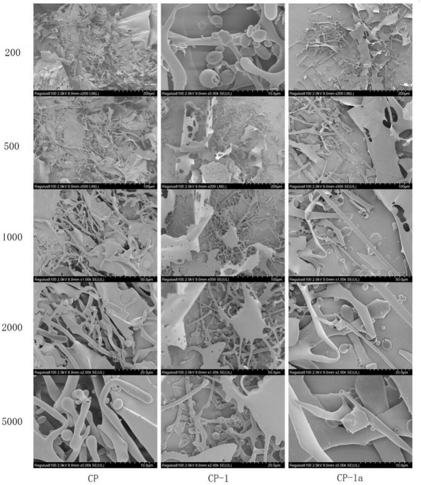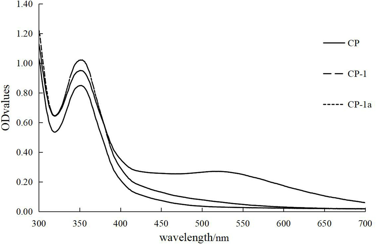 As shown in Figure 6, CP has a maximum absorption peak at 565 nm, and CP-1 and CP-1a lack absorption peaks at this position. Compared with CP, the purified polysaccharide has a relatively long sugar chain and more side chains, which may reflect the destruction of the original polysaccharides structure and the reduction of oligosaccharides in the crude sample during the purification process. Some of the original short chain structure may be destroyed, causing the relative amount of long fragments to increase.
