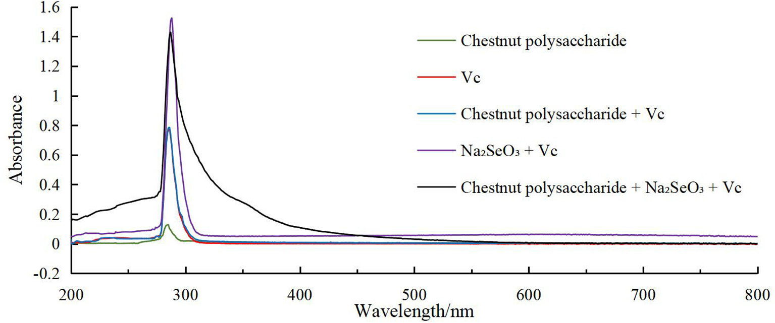 Nano-selenium polysaccharides have the basic properties of a colloid. For a colloidal solution, the stability is closely related to the size of the colloidal particle, that is, the smaller the particle size, the higher the stability. Therefore, the absorbance of Se-chestnut polysaccharides can be measured by the dual-wavelength method to assess a size change of nano-selenium particles (32–35).