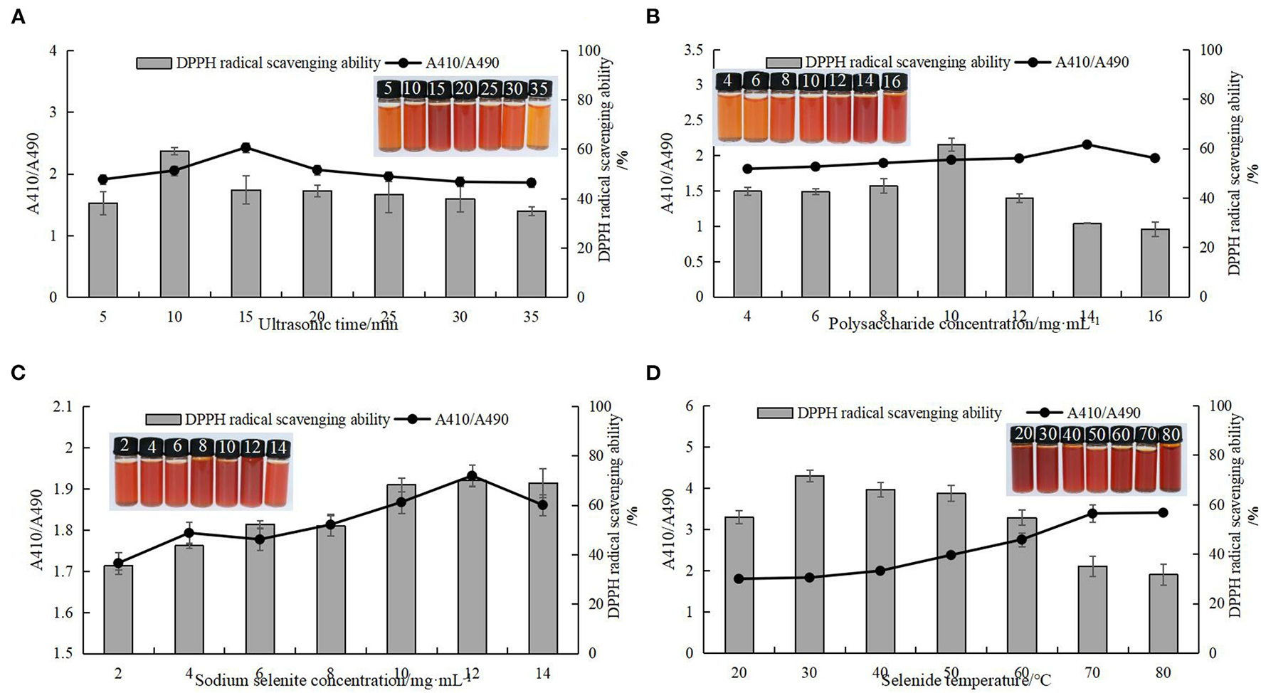 The four factors of ultrasonic time, chestnut polysaccharide concentration, sodium selenite concentration, and selenization temperature were tested for effects on yield of Se-CP. The DPPH clearance rate was used as the index, and the above factors were tested by single factor experiment, as shown in Supplementary Table 3.