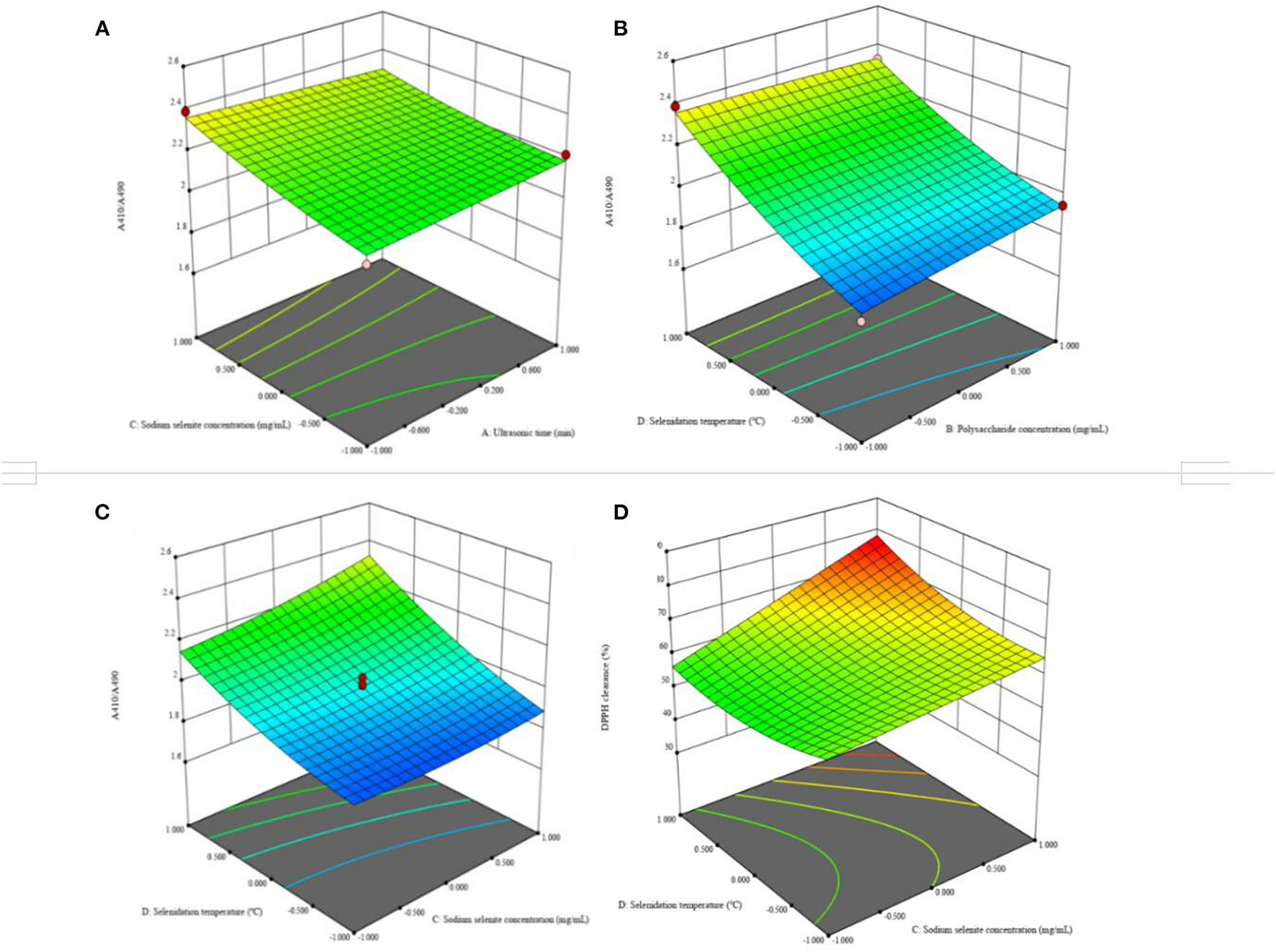 According to the single factor test results and the Central Composite Design (CCD) Design principle, orthogonal experiment design was carried out using the Design Expert 12.0 software. The ultrasonic time, chestnut polysaccharide concentration, sodium selenite concentration, and selenization temperature were selected as the investigation factors, and the mathematical model between the response value and the influencing factors was established. The experimental design factors and levels are shown in Supplementary Table 4.