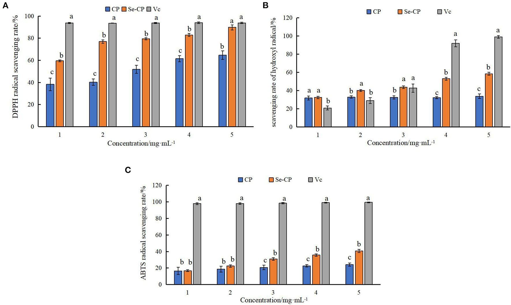 The scavenging activities of un-modified polysaccharide and nano-Se polysaccharide were determined for DPPH, hydroxyl, and ABTS radicals (25–28). The experiment included a blank group, sample experimental group, and sample control group. The polysaccharide concentrations tested were 1.0, 2.0, 3.0, 4.0, 5.0, 6.0, 7.0, 8.0, 9.0, and 10.0 mg·mL−1, and the Se-polysaccharide concentrations were 1.0, 2.0, 3.0, 4.0, and 5.0 mg·mL−1. The experiment was repeated three times with ascorbic acid (Vc) as the positive control and average values were calculated.