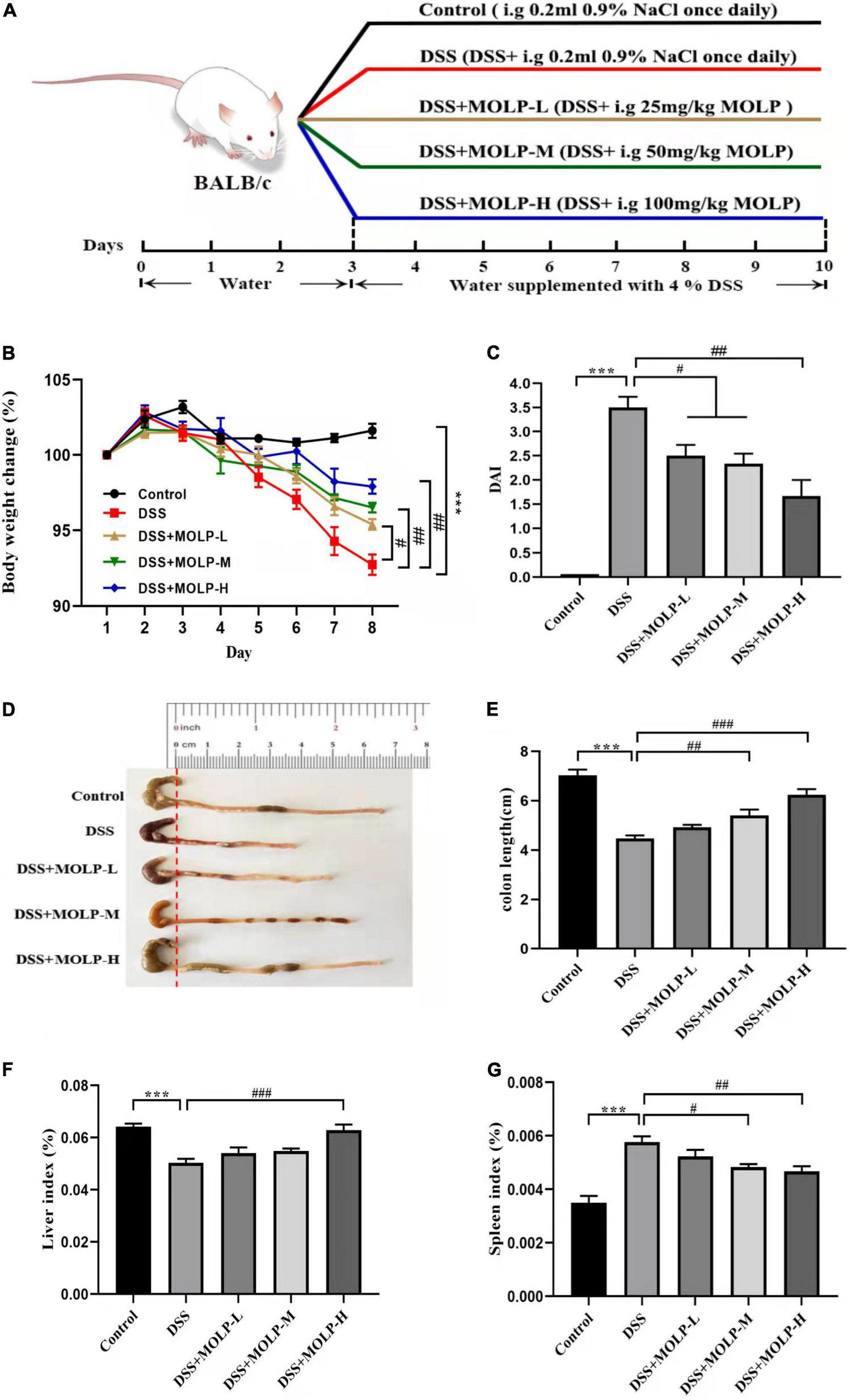 Figure 1. Effect of MOLP on the symptoms of mice with ulcerative colitis. The experimental design (A), changes of body weight (B), DAI (C), the status (D) and length (E) of colon, indexes of liver (F) and spleen (G). Data are presented as mean ± SEM (n = 8), ***P < 0.001, DSS vs. Control; #P < 0.05, ##P < 0.01, ###P < 0.001, DSS + MOLP-L, DSS + MOLP-M and DSS + MOLP-H vs. DSS.