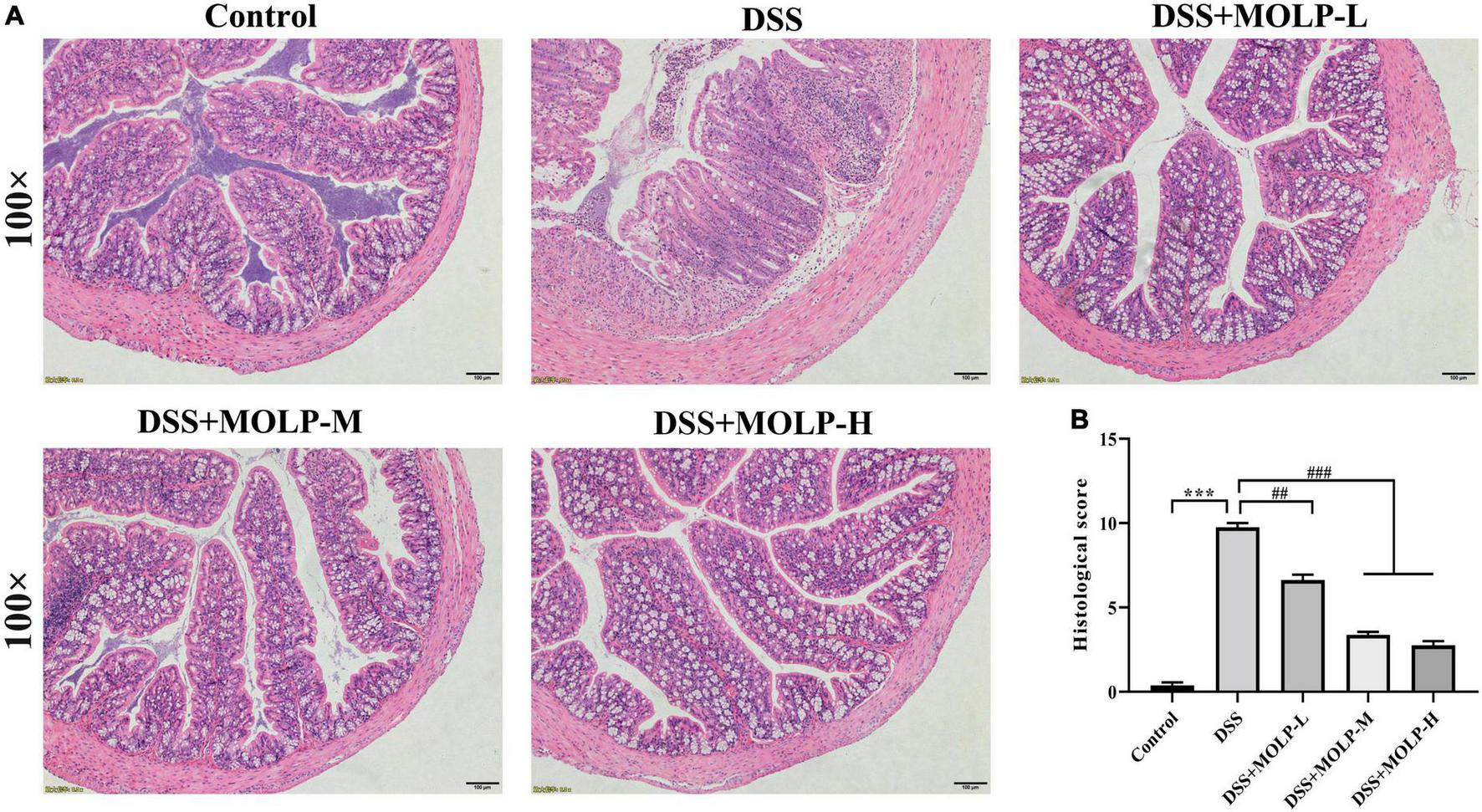 Figure 3. Effect of MOLP on histopathological changes of mice with ulcerative colitis. Histology analysis of colon tissues by HE staining (A), histological sore (B). Data are presented as mean ± SEM (n = 8), ***P < 0.001, DSS vs. Control; ##P < 0.01, ###P < 0.001, DSS + MOLP-L, DSS + MOLP-M and DSS + MOLP-H vs. DSS.
