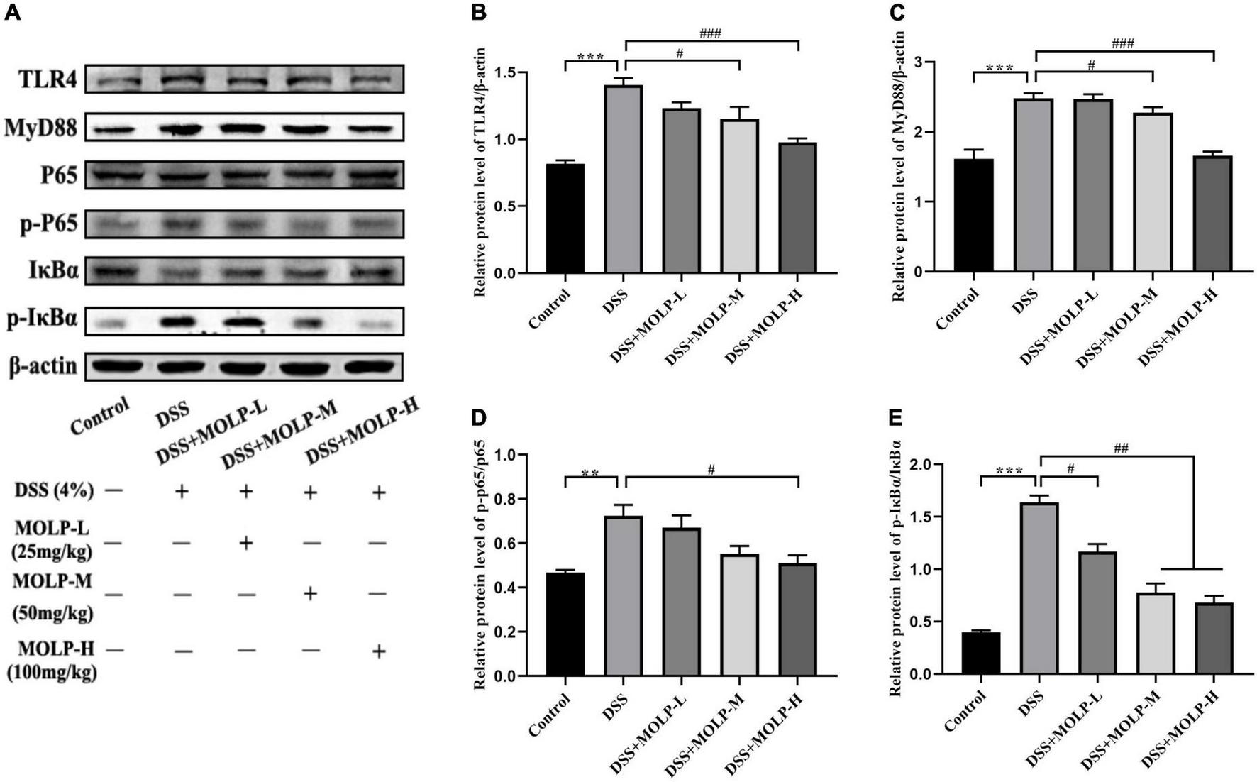 Figure 5. Effect of MOLP on colon tissues in mice with ulcerative colitis. Western blot analysis of key signaling proteins in colonic tissue (A), TLR4 (B), MyD88 (C), NF-κB p65/p-P65 (D) and p-IκBα/IκBα (E). Data are presented as mean ± SEM (n = 3), **P < 0.01, ***P < 0.01, DSS vs. Control; #P < 0.05, ##P < 0.01, ###P < 0.001, DSS + MOLP-L, DSS + MOLP-M and DSS + MOLP-H vs. DSS.