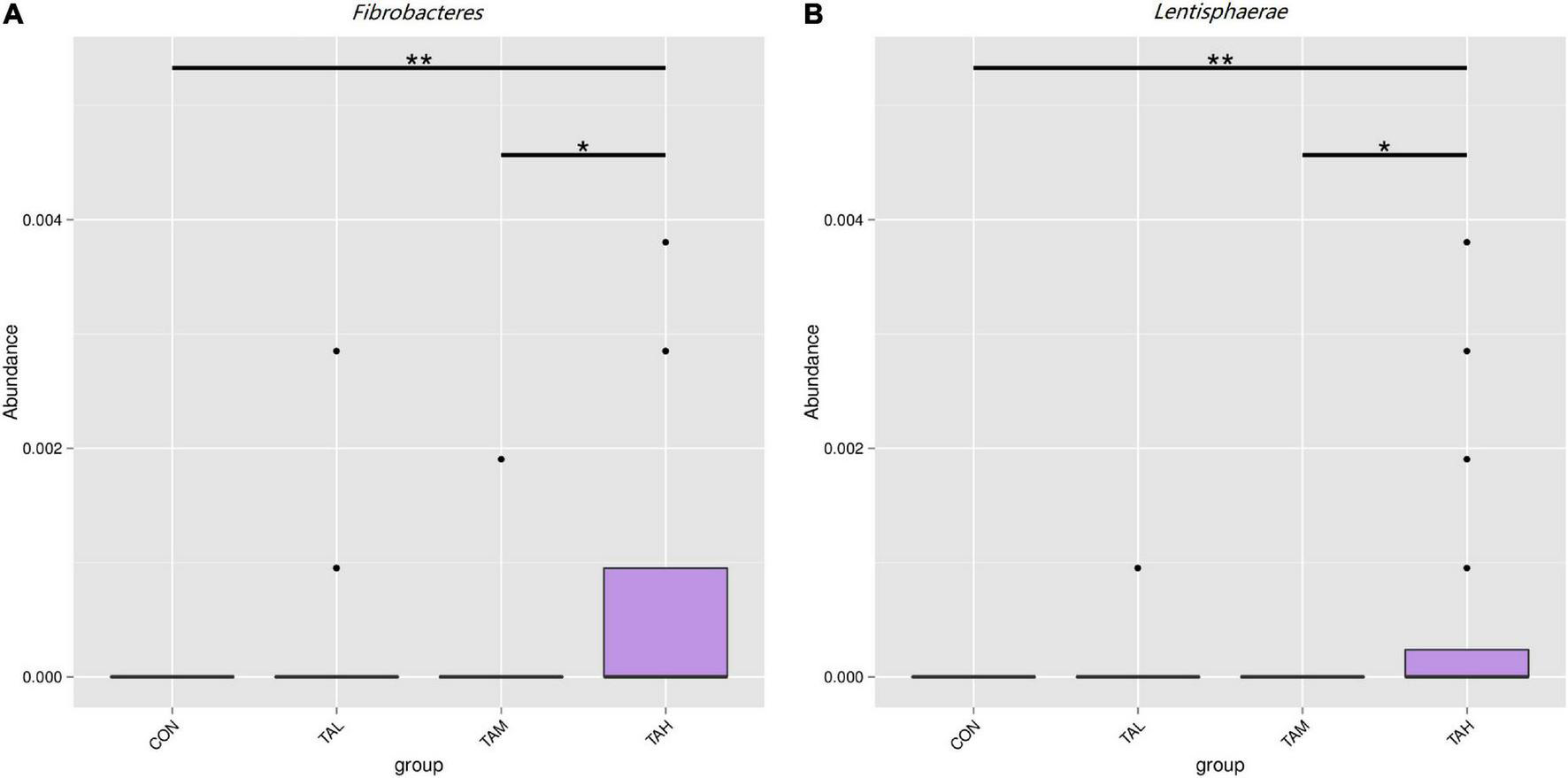 The PROC MIXED procedure of SAS (V9.4, SAS Institute Inc., Cary, USA) was used to evaluate the effects of supplementing TA at different doses on nutrient intake, production performance, nutrient digestibility, rumen fermentation parameters, and physiological and immunological indexes. For the statistical analysis of nutrient intake, performance, and nutrient digestibility, the statistical model included dose, sampling date, and their interaction as the fixed effects, with sampling date as the repeated measurement and individual pen as the experimental unit. As to the statistical analysis of rumen fermentation profiles, blood physiological and immunological indexes, and the Alpha diversity indices, the statistical model included dose, sampling date, and their interaction as the fixed effects, with sampling date as the repeated measurement and individual animal as the experimental unit. Linear and quadratic effects of dose were analyzed using orthogonal polynomial contrasts. Least squares means are reported throughout the text. Statistical difference was, respectively, declared as significant or highly significant at P < 0.05 or P < 0.01, while trend was discussed at 0.05 < P ≤ 0.10. The Metastats analysis was employed in the multiple comparison of bacterial relative abundances across treatments through the permutation test, and the q-values [i.e., the false discovery rate (FDR) adjusted P-values] were adopted (36). The significant difference or highly significant difference were thence considered at q < 0.05 or q < 0.01, respectively.
