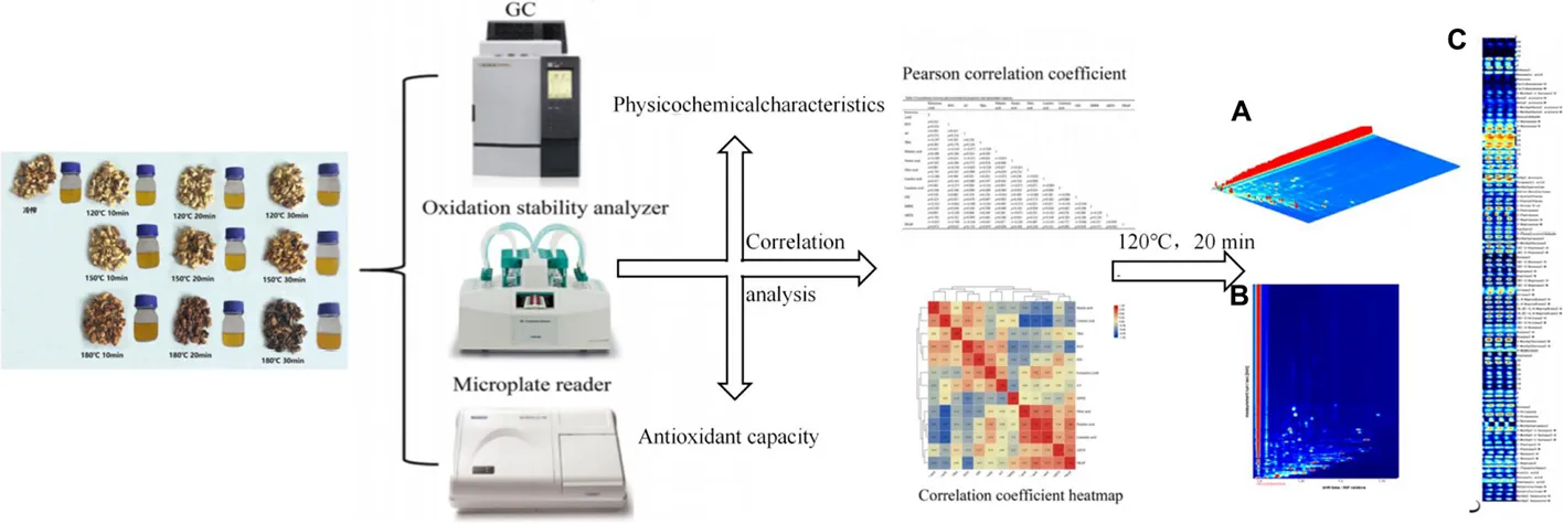 The physicochemical properties and antioxidant capacity of walnut oil obtained by pressing walnut kernels after different roasting times and temperatures were compared, and the correlations between these indicators were analyzed using Pearson correlation coefficients and correlation coefficient heat maps, and the volatile organic compounds of walnut oil under optimal pretreatment roasting conditions were evaluated using headspace-gas chromatography-ion mobility spectrometry.