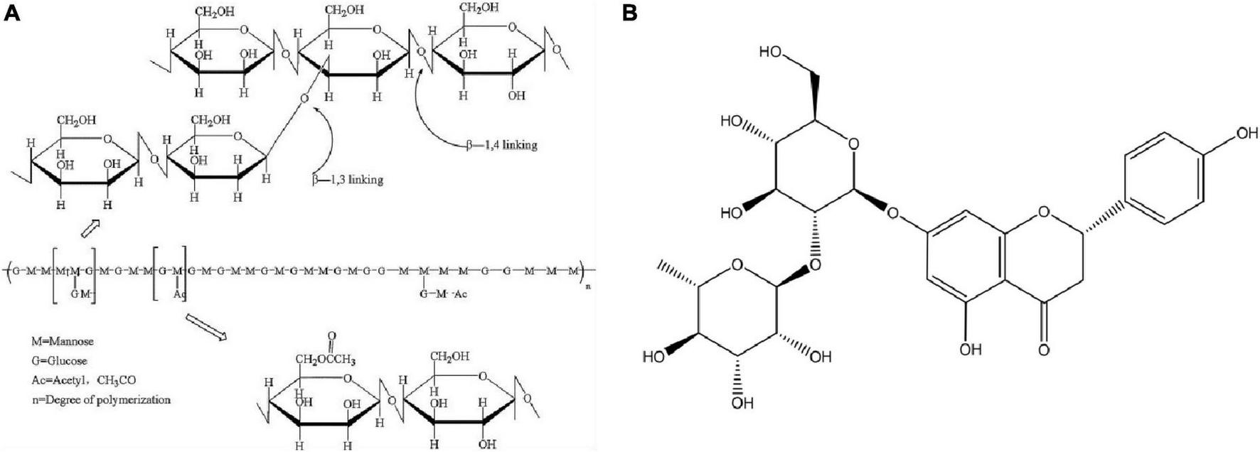 In recent years, natural polymer sustained-release carriers have become the focus of attention because of their excellent biocompatibility, degradability, and abundant sources (1). Konjac glucomannan (KGM) is a functional polysaccharide whose chemical structure is shown in Figure 1A (2). KGM is a good gel and thickener in food because of its edible and stable physicochemical properties and has been used to control body weight and intestinal health (3). In addition, KGM is also widely used in packaging and biomedical fields, and has been used to prepare sustained-release carrier systems. KGM-based sustained-release materials, such as hydrogel film microspheres, have been widely studied (4–6). Based on the excellent physical and chemical properties of KGM, the gel based on KGM can drive the release of active substances, and its good swelling performance can obviously improve the release of functional compounds. But the pure KGM gel has the problem of strong hydrophilicity and poor mechanical properties, which cannot protect the active substances and slow-release effect (7, 8). Sodium alginate (SA) and its aqueous solution generally have high viscosity and can be used in food industry to promote food quality technology, such as thickeners, stabilizers, emulsifiers, and so on. With the development of sustained-release systems and biomedical materials. SA can be used as a biomagnetic, conductive and pH-sensitive gel carrier material with different functions, and is widely used to immobilize or embed active small molecules, proteins and drugs in the form of hydrogels, aerogels, and microcapsules (9, 10). Because of these excellent properties, SA has been widely used in the food industry, tissue engineering, biomedicine, and other fields.