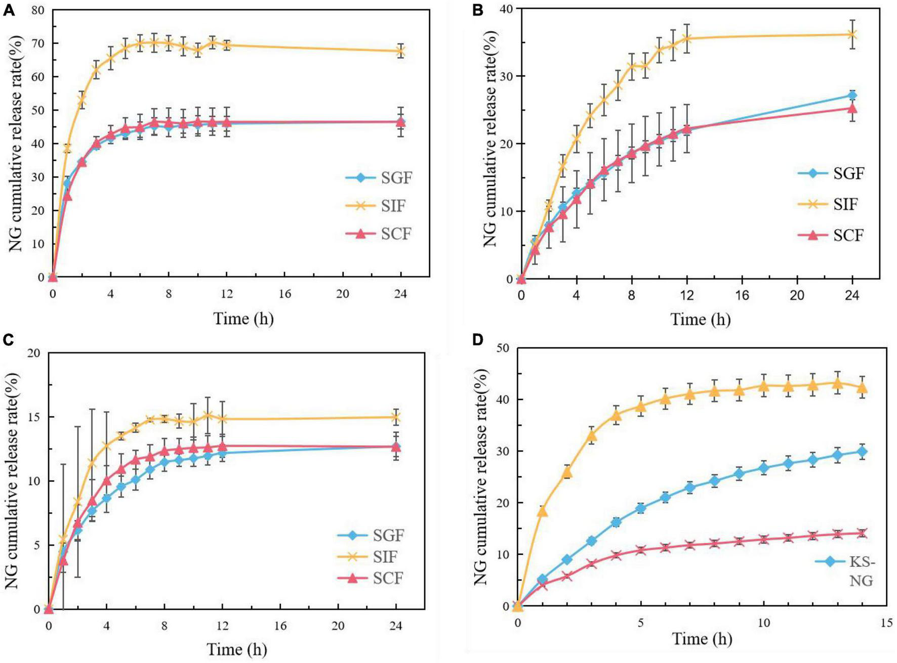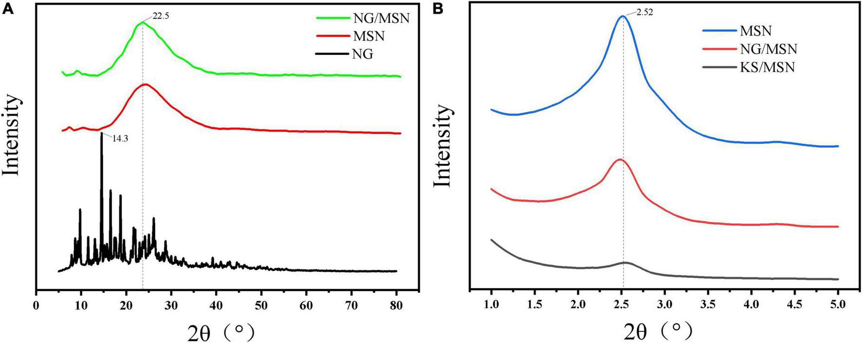 Figure 3 is the XRD diffraction pattern of NG nanoparticle gel spheres used to explore the internal crystal structure of KS gel. Figure 3A shows the wide-angle XRD diffraction peaks of MSN, NG, and NG/MSN. NG has an obvious sharp peak at about 14.3°. The diffraction peak trends of NG/MSN and KS/MSN are similar (25). The spectra show a wide peak peculiar to amorphous samples, but no NG diffraction peak peculiar to the crystalline phase. The absence of the drug crystalline phase indicates that NG is adsorbed in an amorphous state in the mesopore of the carrier (26), which indicates that there is a good physical interaction between them. NG may be adsorbed in the pores of MSN or polysaccharide coated on the surface of MSN The main problem of drug solubility is that the crystalline state has higher lattice energy. The thermodynamic properties (enthalpy, entropy, and free energy) of the amorphous state are higher than those of the corresponding crystalline phase, which makes amorphous solids easier to crystallize (27). The migration of nano-restricted molecules in the pores of monodisperse silica makes the amorphous phase of drugs remain stable after adsorption in the carrier. Wide-angle XRD was used to characterize the presence of NG in the MSN carrier. Low-angle XRD spectra are sensitive to pore filling, and the intensity of characteristic peaks of loaded materials is lower than that of pure materials. The main characteristic peaks in the range of 2–2.8° appeared in the XRD spectra of all materials, indicating that the MSN structure is intact (28).