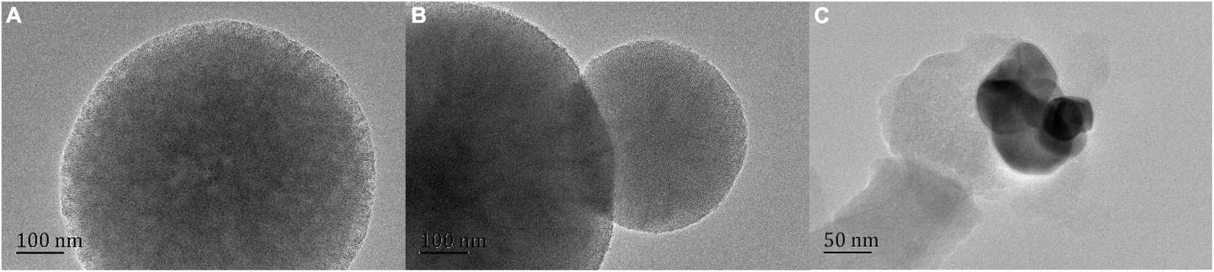 Scanning electron microscope (SEM) images of MSN (A) and NG/MSN (B), and KS-NM (C).