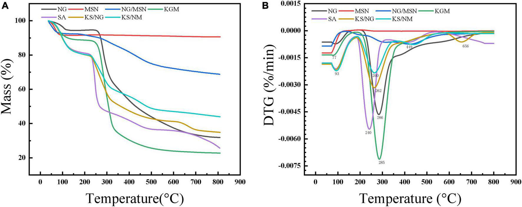 TGA curves (A) and DTG curves (B) of NG, MSN, NG/MSN, KGM, SA, KS/NG, and KS/NM.